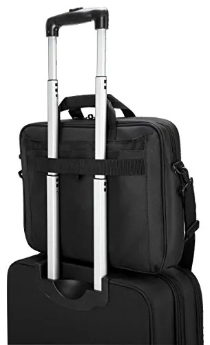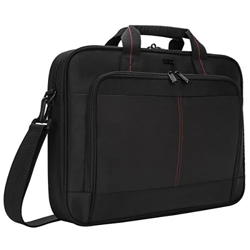 The Targus 16" Classic Slim Briefcase is a thin, lightweight case equipped to store all of your essentials on the go. Ideal for the casual business executive, this functional case features a classic look with red accents. The spacious front pocket includes smartly organized compartments to store your smartphone, pens, business cards, adapters, cords, and other accessories. Constructed of durable polyester material, the case includes metal, contoured zipper pulls, and comfortable padded handles and shoulder strap. The large back slip pocket is great for storing files and documents while the included trolley strap makes it easy to stack this case onto rolling luggage.