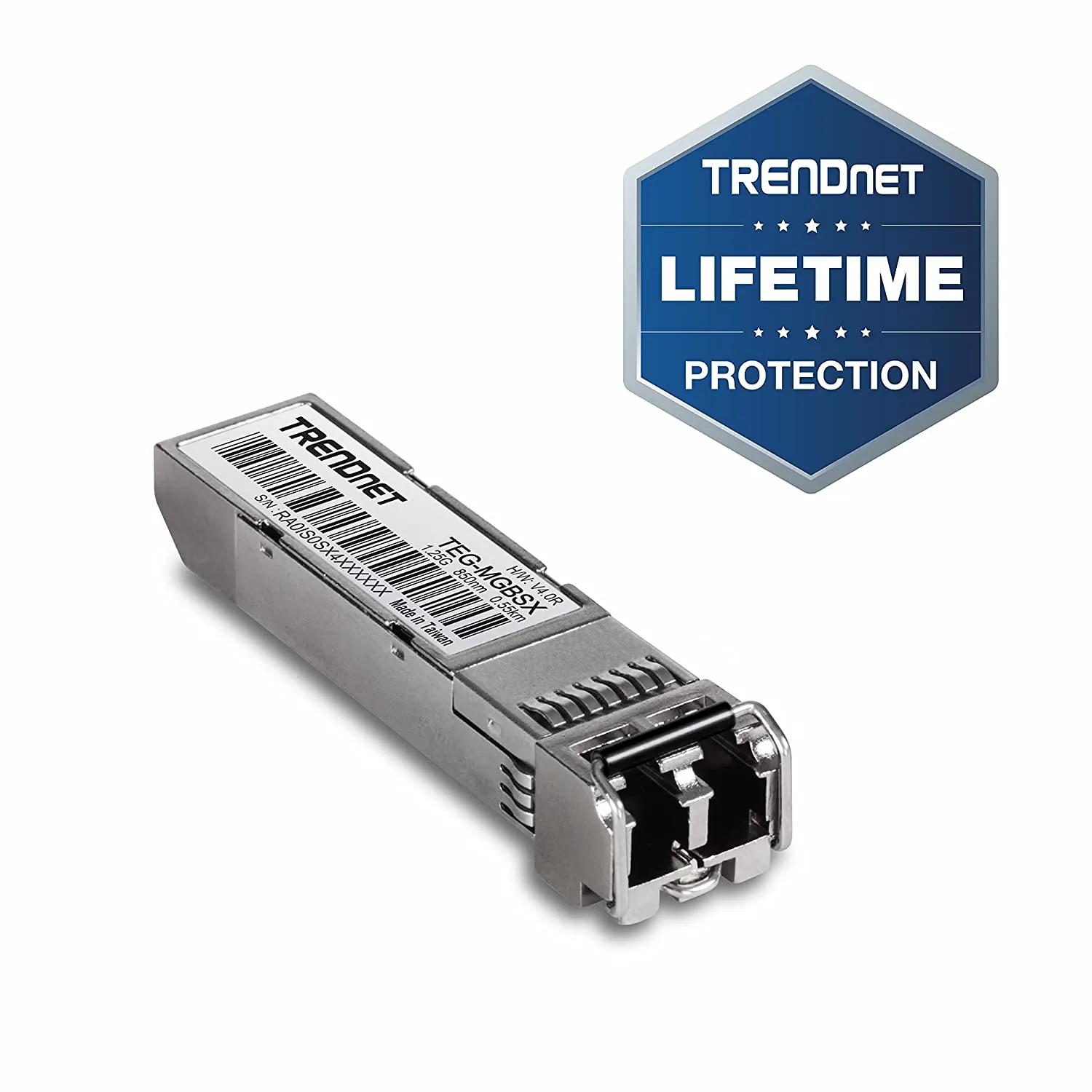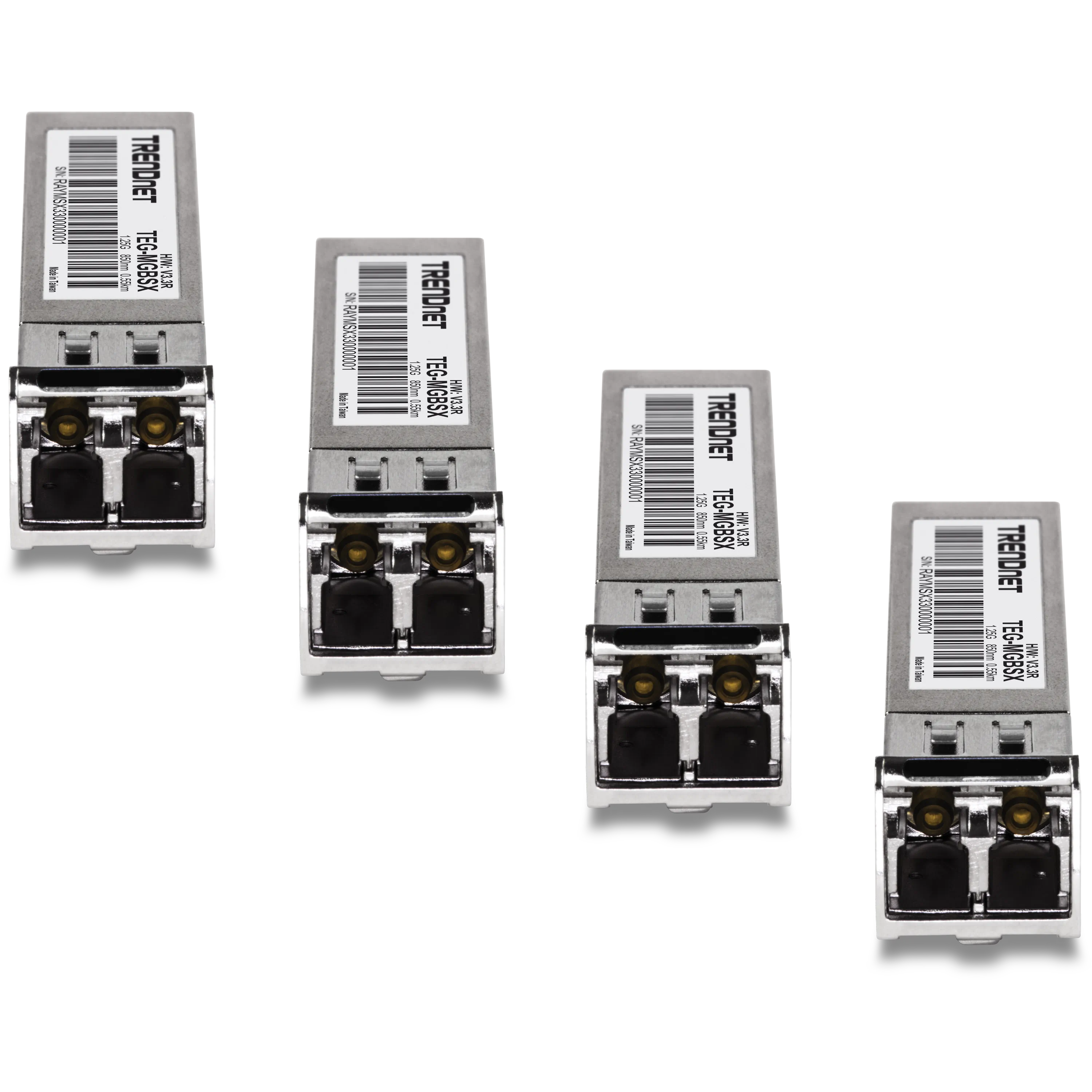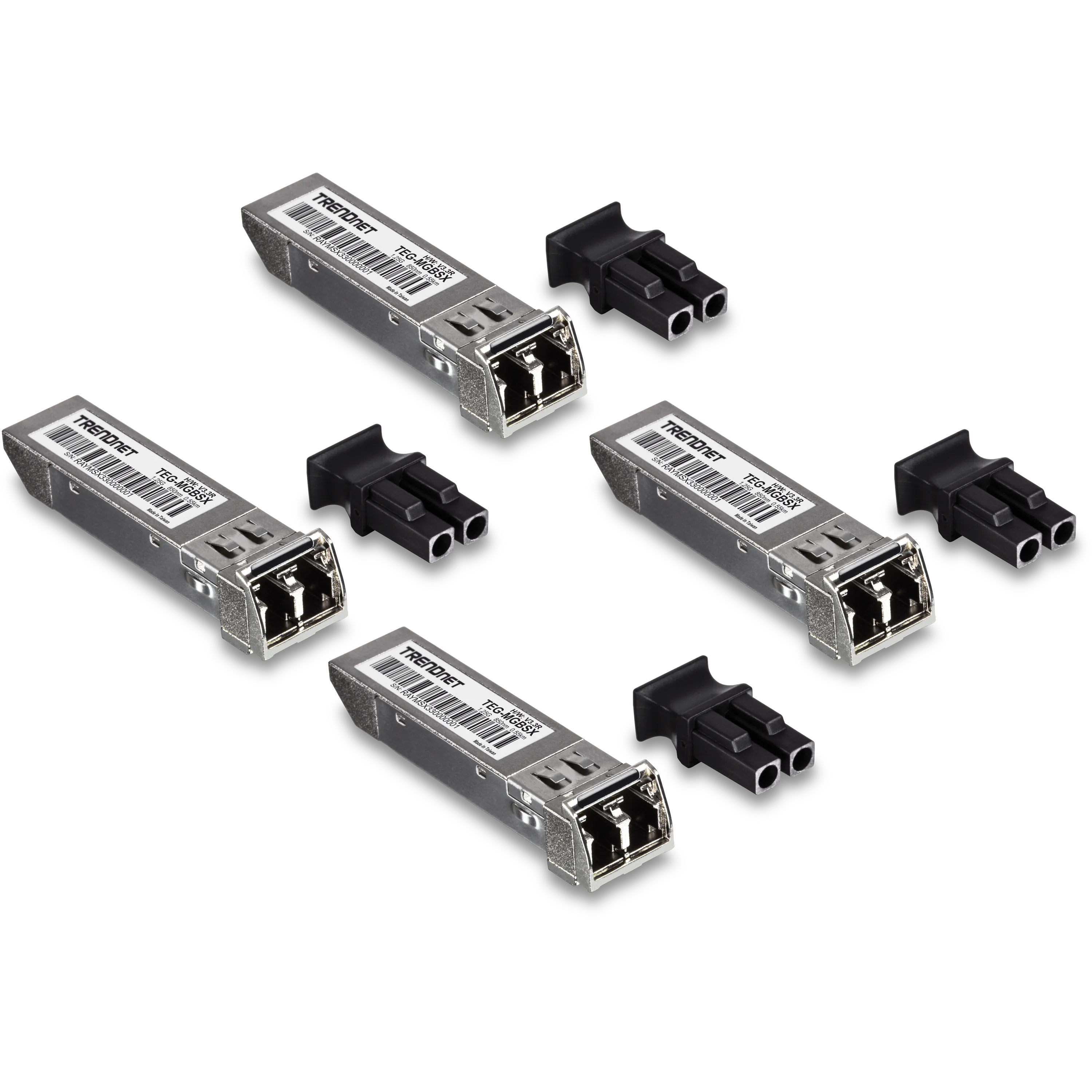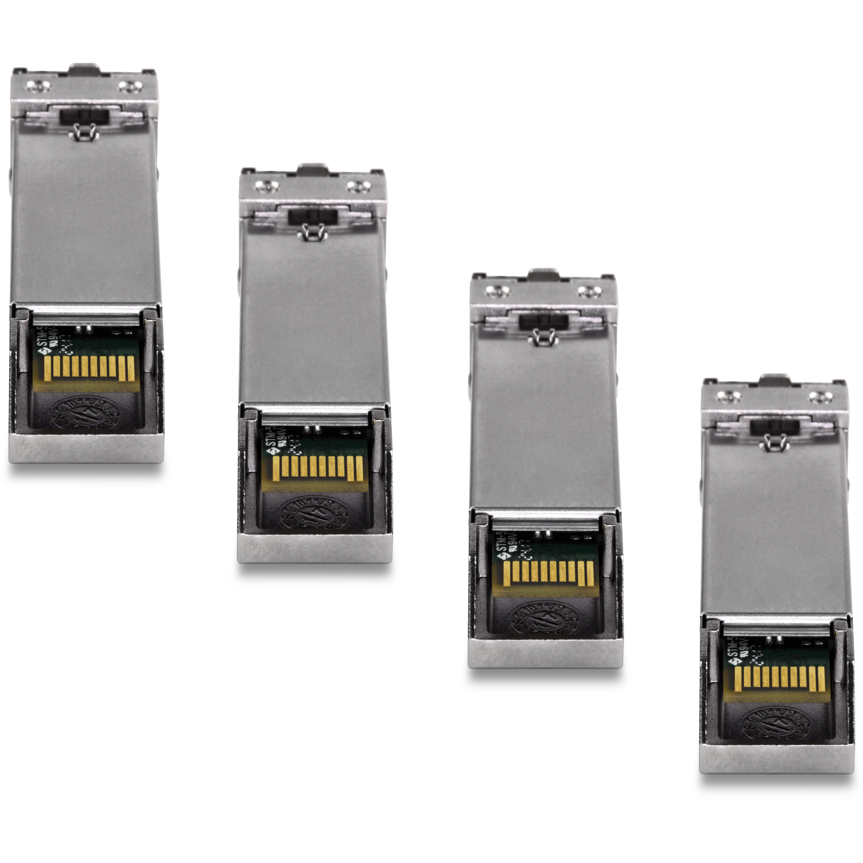 This 4-pack of multi-mode LC fiber SFP transceiver modules supports data rates up to 1 Gbps over 550 meters.