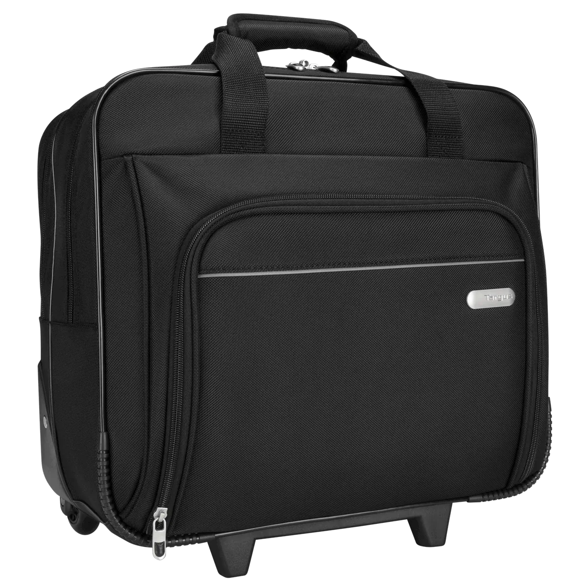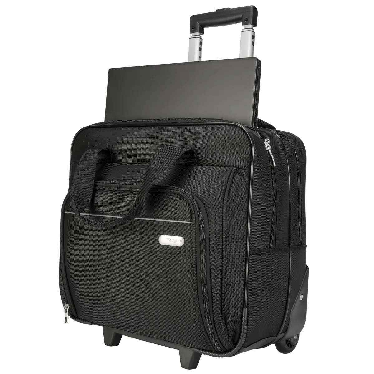 The Targus Metro Rolling Notebook Case is designed to protect notebooks with up to 15.4 screens. The closed cell foam padding keeps your notebook protected while the durable/water resistant 1200D polyester material keeps belongings dry in wet weather. The front zip-down workstation includes pen loops, a business card holder, zippered pocket, cell phone pocket and large pouch to store additional accessories. The Metro Rolling Notebook Case also includes a large zippered compartment to store office essentials or clothing for overnight trips. The telescoping handle retracts into a zippered compartment when not in use and the case includes a dual carry handle for added convenience. The Metro Rolling Notebook Case is a functional transit case designed for professionals on the go.