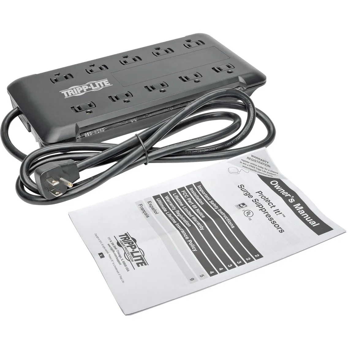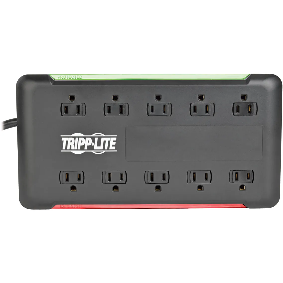 10-outlet surge protector features a surge protection rating of 2880 joules to defend your sensitive electronic components against strong surges and spikes. Surge protector includes full normal mode (H-N) and common mode (N-G/H-G) line surge suppression as well as technology that filters out EMI/RFI line noise to prevent interference from disrupting your electronics and inflicting damage or data loss. NEMA 5-15R outlets are widely spaced to accept bulky transformers without blocking adjacent outlets. Safety covers keep dust and debris away from unused outlets. Integrated 15A circuit breaker protects all of the outlets and shuts down your connected equipment in case of overload. On/off switch provides one-touch control over your connected equipment at once. Diagnostic LED bars indicate power and protection status at a glance. The 6' AC power cord with right-angle NEMA 5-15P plug allows furniture and equipment to be placed flush against the wall.Tripp Lite 10-Outlet Surge Protector Power Strip 6ft Cord 2880 Joules Black