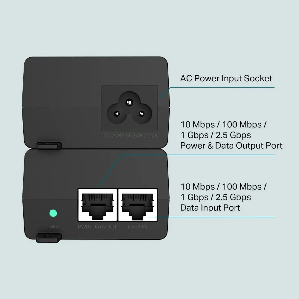 Introducing the Compact 2.5G PoE+ Injector Adapter, designed for high-speed data and power delivery over a single cable. It features: