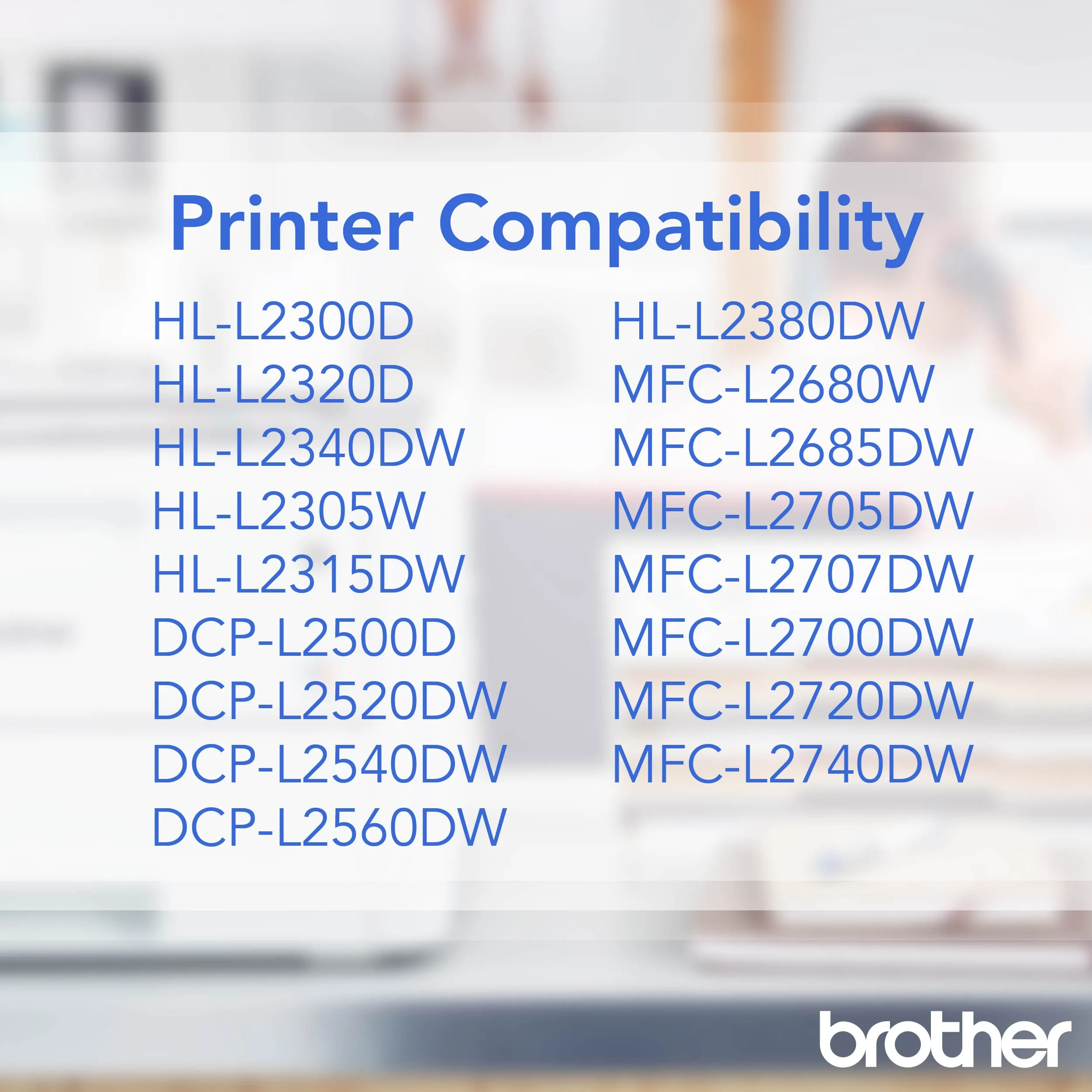 High-yield toner cartridge produces crisp, clear output. Cartridge is designed for use with Brother DCP-L2520DW, DCP-L2540DW, HL-L2300D, HL-L2305W, HL-L2315DW, HL-L2320D, HL-L2340DW, HL-L2360DW, HL-L2380DW, MFC-L2680W, MFC-L2685DW, MFC-L2700DW, MFC-L2705DW, MFC-L2707DW, MFC-L2720DW and MFC-L2740DW. All genuine Brother printer supplies are designed as part of an entire printing system to provide a superior degree of quality. Genuine Brother toner is delicately balanced to provide even flow and toner distribution. Each cartridge yields approximately 2,600 pages. Yield may vary by type of use.