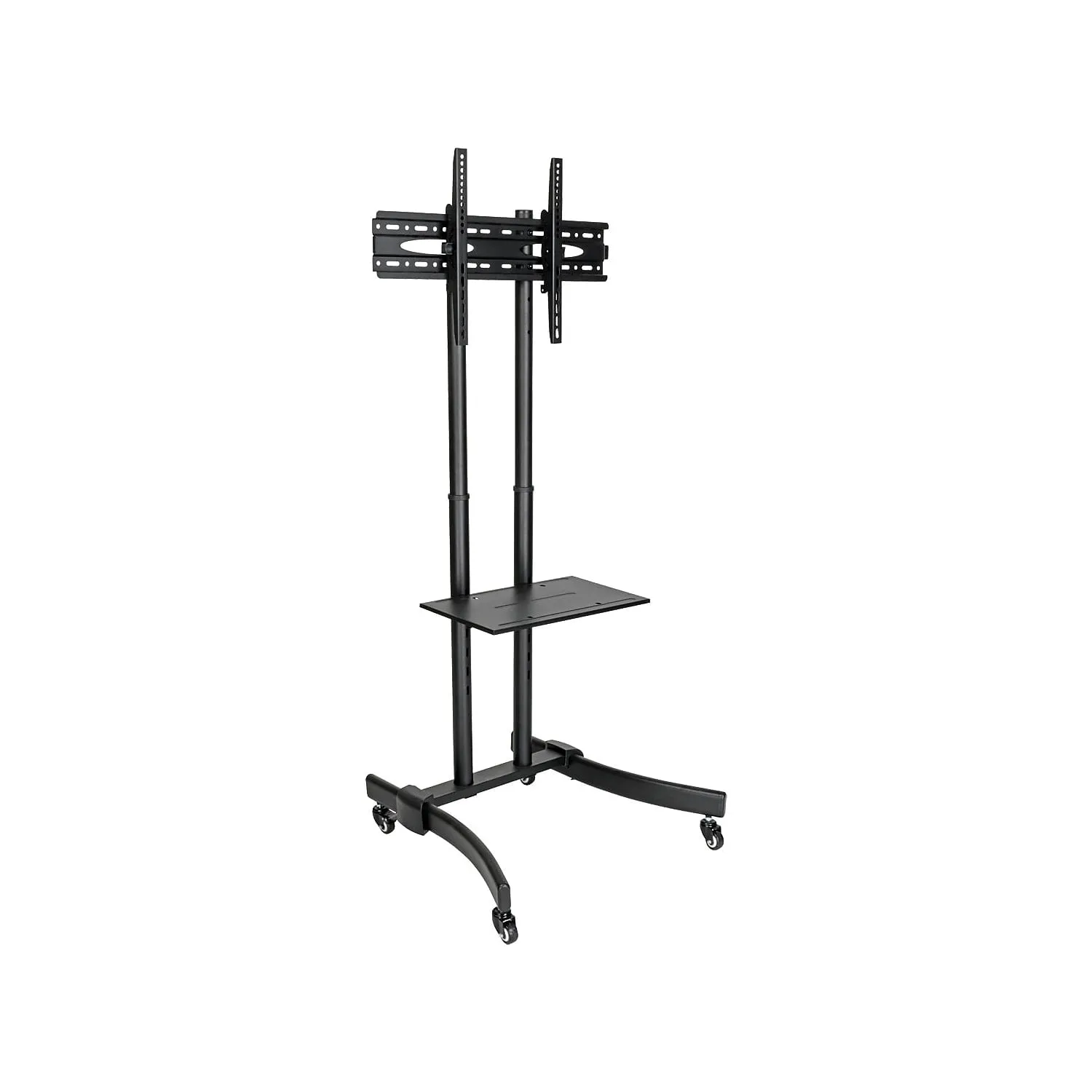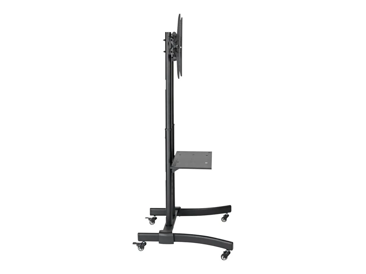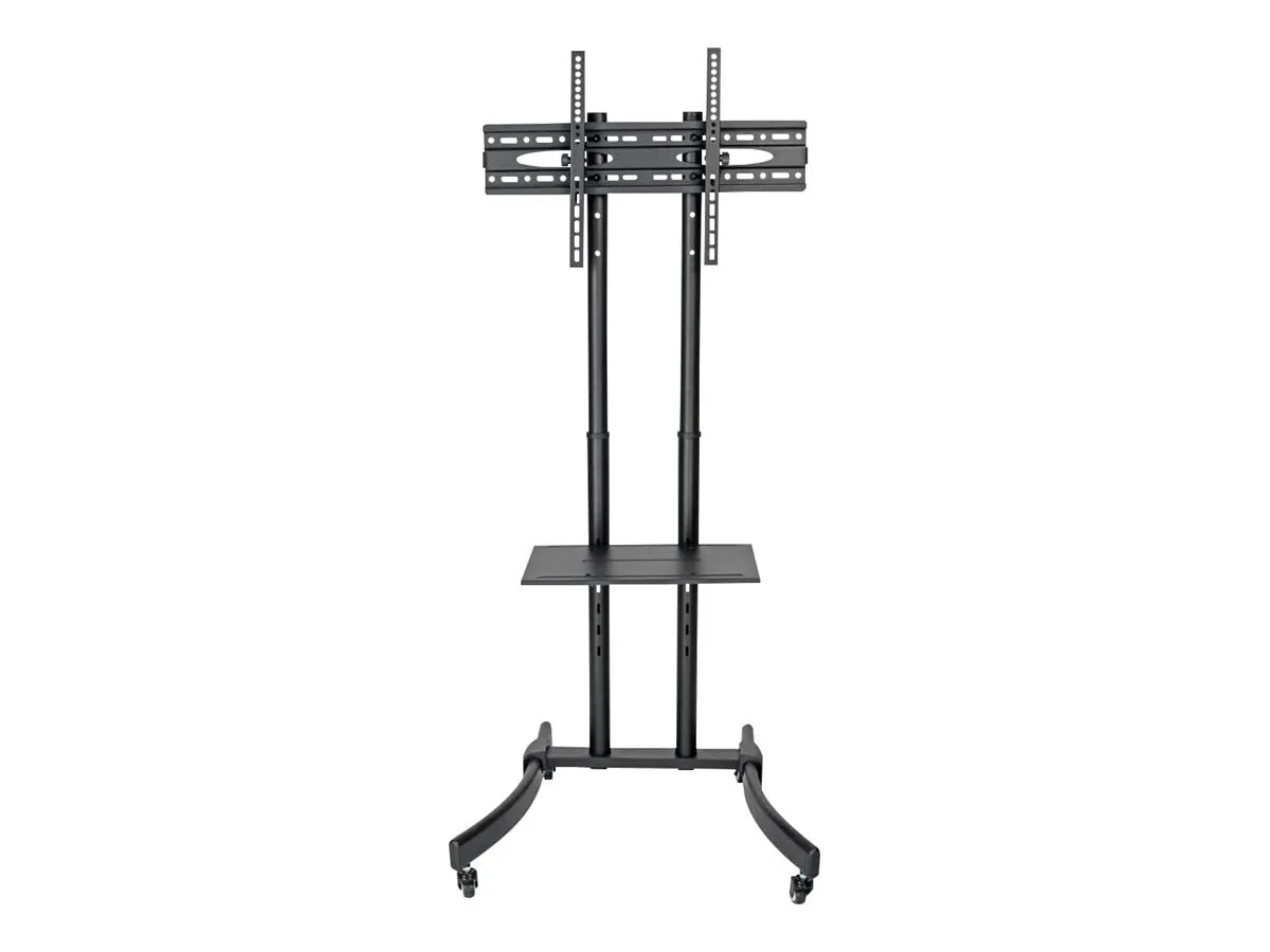 The Tripp Lite DMCS3770L is a heavy-duty mobile TV/monitor cart designed to provide a portable and versatile display solution for classrooms, lecture halls, offices, and other environments. It supports a single flat-panel display from 37 to 70 inches and weighing up to 110 lbs (50 kg). The cart features a durable steel frame with a black powder-coated finish and smooth-rolling, locking casters for easy movement and secure positioning. It offers height adjustment from 47.6 to 63 inches, a wide range of VESA mounting patterns, and a +-15? tilt capability for optimal viewing angles. An adjustable camera shelf above the display and a component shelf below provide space for additional equipment, making it ideal for video conferencing and presentations.