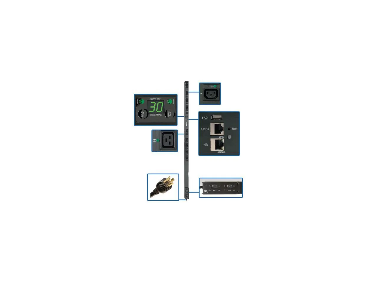 General InformationThe PDUMVR30HVNETLX 5/5.8kW Single-Phase Switched PDU provides advanced network control and remote power monitoring with the ability to turn on, turn off, reboot or lock out power to each outlet. Recommended for any IT or industrial application, it features 24 switched outlets (20 C13 and 4 C19). LEDs indicate each outlet's on/off power status, and you can monitor each outlet's power consumption remotely or via digital display. A 10-foot cord with NEMA L6-30P plug connects the PDU to a compatible AC power source, generator or protected UPS.The built-in Java-free HTML5-based LX Platform interface enables full remote access for power monitoring, configuration, control and email notifications via secure web browser, SNMP, telnet or SSH. It supports 10/100 Mbps auto-sensing for optimum communication with an Ethernet network. Optional EnviroSense2 modules (sold separately) provide a variety of environmental monitoring capabilities. Protocols supported include HTTP, HTTPS, SMTP, SNMPv1, SNMPv2, SNMPv3, telnet, SSH, FTP, DHCP and NTP.A digital LED meter allows you to monitor each bank's load in real time to ensure the PDUMVR30HVNETLX is used at maximum capacity with no danger of overload. The PDU mounts in 0U of space in EIA-standard 19-inch racks using the included toolless mounting buttons or the included rack-mounting brackets. Use the includedPDUMVROTATEBRKT kit to install the unit with outlets facing the rear for better airflow or equipment access.Technical InformationInput Receptacles: NEMA L6-30POutput Receptacles: 4 x IEC 60320 C19Output Receptacles: 20 x IEC 60320 C13Protection Type: Overload ProtectionPower DescriptionInput Voltage: 230 V ACOutput Voltage: 230 VPower Rating (Watt): 5800 WInput Current: 30 AManagementManagement: HTTP HTTPS PowerAlert SMTP SNMPv1 SNMPv2 SNMPv3 Telnet SSH FTP DHCP and NTP Physical CharacteristicsMounting Orientation: VerticalPlacement: RackRack Height: 0UHeight: 70"Width: 2.2"Depth: 2.6"Weight (Approximate): 12 lbMiscellaneousPackage Contents: PDUMVR30HVNETLX 24-Outlet PDU Configuration Cable 24 x Cable ties Rack-mounting Hardware Owner's Manual Environmentally Friendly: YesEnvironmental Certification: RoHSTAA Compliant: YesWarrantyLimited Warranty: 2 Year