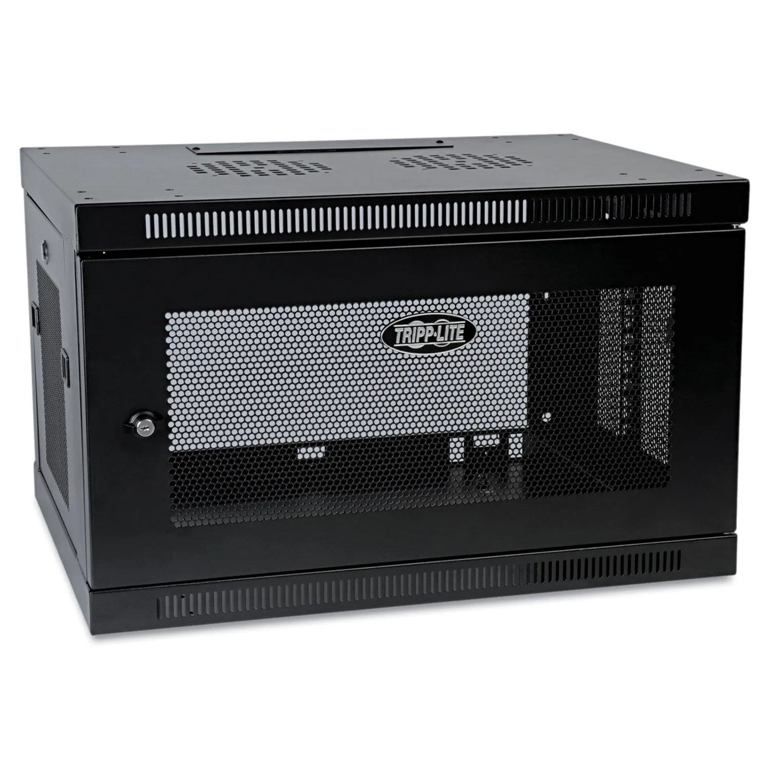 The Tripp Lite SmartRack SRW6U is a sturdy and lockable 6U wall-mount rack enclosure cabinet that provides a secure and organized solution for housing essential rackmount equipment. Its low-profile design minimizes protrusion from the wall, making it ideal for areas with limited space. The cabinet features removable side panels for easy access to equipment, top and bottom cable access ports, and ventilation slots to promote airflow. It supports a maximum internal depth suitable for most shallow-depth networking and telecom equipment. The SRW6U helps to protect equipment from dust, tampering, and accidental damage, ensuring reliable operation.
