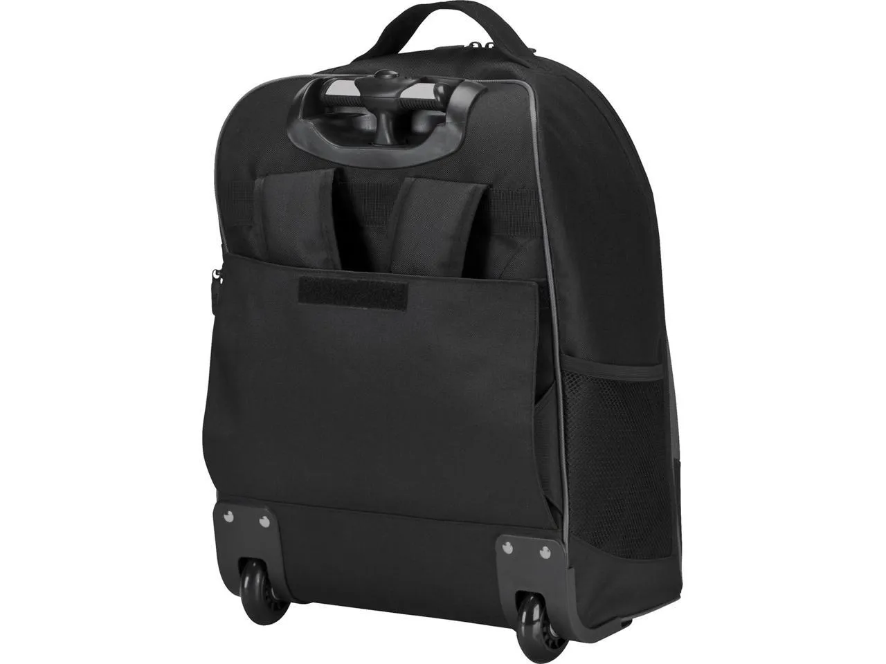 The Targus 16 Compact Rolling Backpack in sleek black goes anywhere you go. Use it as a carry on or a bag for getting around campus this backpack is functional in every way. Fully equipped with quiet roller wheels and a retractable handle, youll be rolling your materials easily and comfortably