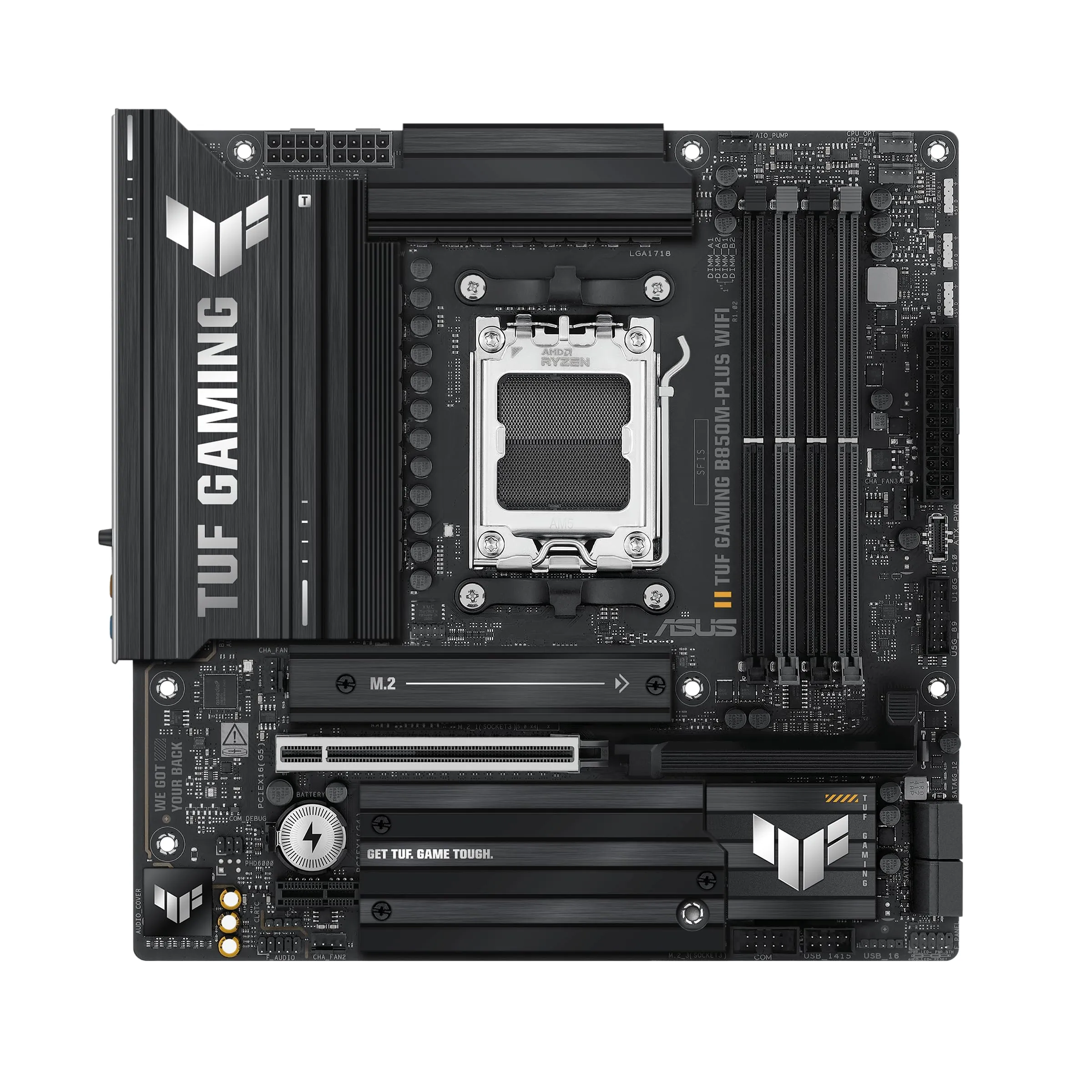 Experience unparalleled performance with the ASUS TUF Gaming B850M-Plus WiFi motherboard, designed for AMD AM5 sockets. It features advanced cooling and power delivery with 14+2+1 80A DrMOS stages, ensuring stability during intense gaming sessions.