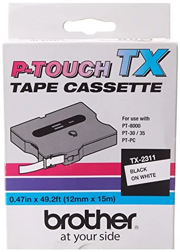 TX Series laminated tape features standard adhesive designed for flat surfaces like office paper, file folders and binders. Use in hot and cold environments. Laminated tape withstands water, grease, grime, abrasion, UV, spills, heat and cold. Use lettering tape with Brother PT-30, 35, 8000 and PC machines. Tape cartridge yields 50'.