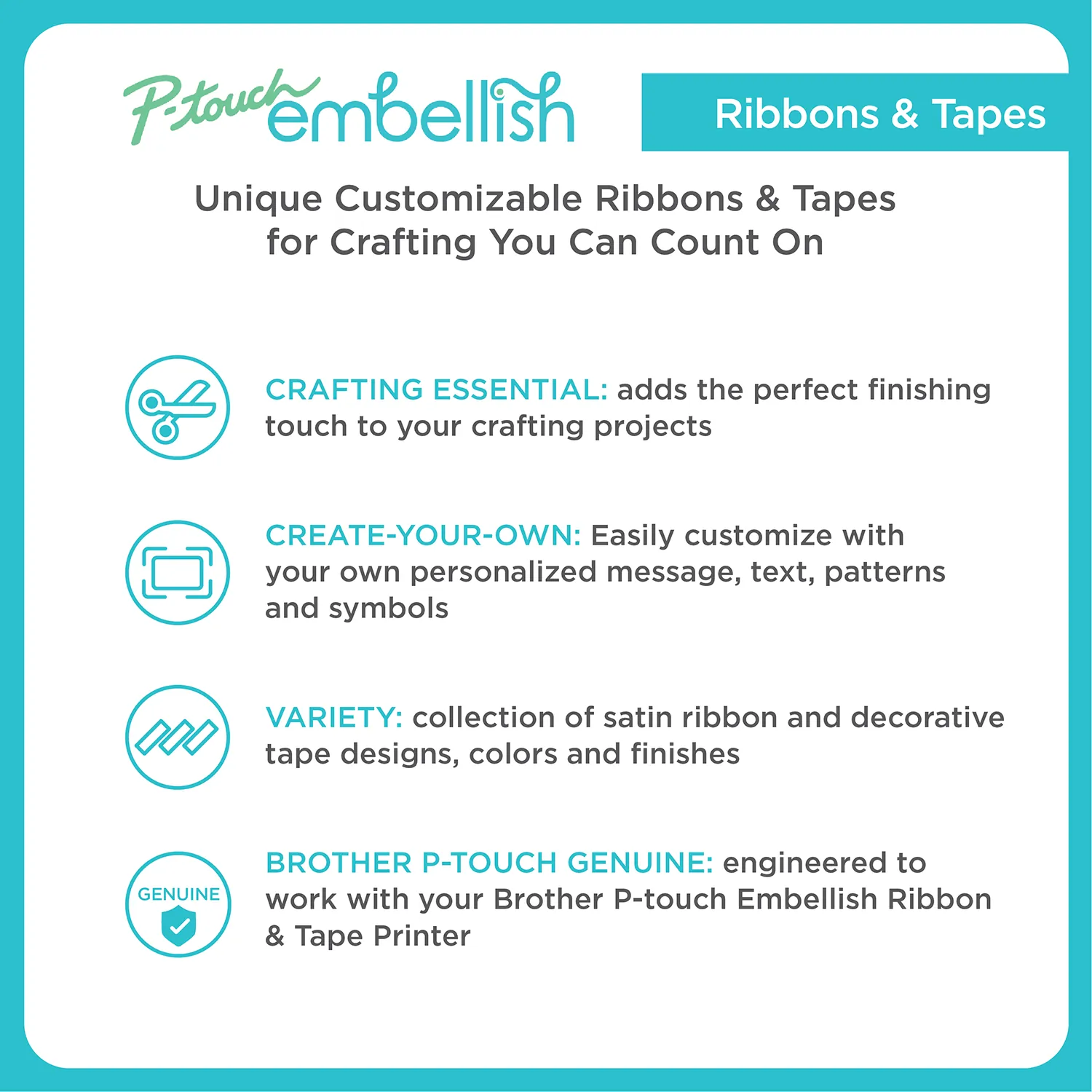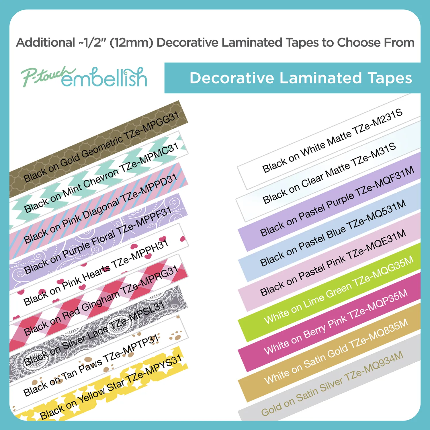 Washi tape is lightly adhesive, allowing for easy repositioning, making it perfect for bullet journaling, card making, and various craft projects. Utilize your P-touch Embellish Ribbon & Tape Printer (PT-D215e sold separately) to customize tapes with a variety of creative fonts, emojis, frames, symbols, and patterns, ideal for any occasion from weddings to birthdays.