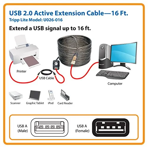 Tripp Lite's 16-ft. USB Certified 2.0 active extension cable is a bus powered extension cable that can be used to increase the length of a device cable without the worry of signal loss and potential performance problems.