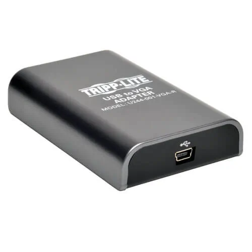USB 2.0 to VGA Adapter - Tripp Lite's U244-001-VGA-R, USB to VGA Display Adapter, enables you to connect an additional monitor or projector to a computer/laptop USB 2.0 port. Up to six U244-001-VGA-R adapters can be used simultaneously, allowing the user to connect up to six additional monitors to a single computer. Once the installation is done, the computer screen appears on the add-on monitor(s) without the hassle of function keys to swap to a second monitor. The U244-001-VGA-R chip-set supports video resolutions up to 1920 x 1080 (60Hz), 1080p (60Hz). The U244-001-VGA-R is compatible with Windows 2000 and later, and Mac OS X 10.4 and later operating systems.