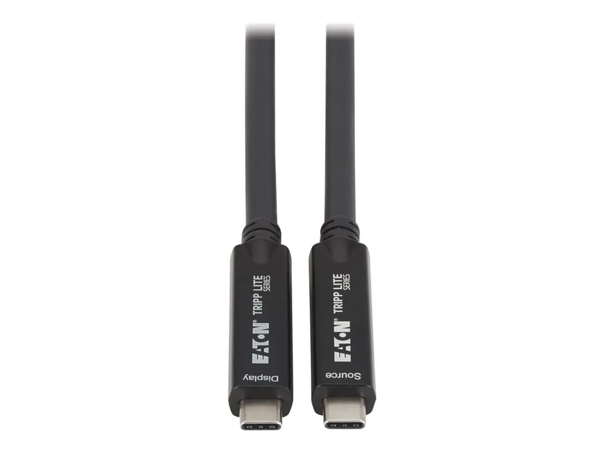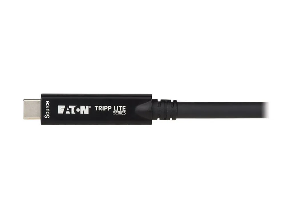 USB-C Fiber Optic Cable Combines Data Transfer and 8K/4K Video. This full-function active optical cable (M/M) securely connects the USB-C, Thunderbolt 3 or Thunderbolt 4 port on your desktop, laptop or notebook computer to a USB-C data or audio/video device, such as a storage device, media server or surveillance camera, located up to 15 meters (49 feet) away. It is ideal for high-end video conferencing, USB camera placement, 3D printers or high-resolution Pro AV devices, such as touchscreen displays, digital signage or travel displays that can be powered via USB-C PD charging. Supports USB-C DisplayPort Alternate Mode for Converting Audio/Video Signals. By connecting the USB-C end to a source device that supports USB DisplayPort Alt Mode, you can output 8K/4K video and digital audio to a USB-C monitor, television or projector without installing special software drivers. Transmits 8K and 4K Video with HDR and 4:4:4 Color. The U420F-15M supports Ultra HD 8K resolutions up to 7680 x 4320 at 60 Hz and 4K resolutions up to 3840 x 2160 at 144 Hz with 30-bit Deep Color. It also supports HDR (High Dynamic Range), providing a wide range of vibrant colors with richer contrast, brighter whites and deeper blacks that pop on your display. HDCP 2.2 encryption allows you to stream 4K content with no loss in resolution. This cable also supports uncompressed 4:4:4 chroma subsampling for top-level PC gaming or using your HDTV as a PC monitor. Transfers Data and Powers Devices for Innovative Workspace Applications. The full-function U420F-15M connects your MacBook Pro, Windows laptop or other USB-C device to the USB-C port on Logitech or Poly video conferencing cameras, touchscreen displays and smartboards. It supports USB 3.2 Gen 2 data transfer rates up to 10 Gbps. It also provides power output up to 20V 2A (40W), which is enough to power most laptops, as well as connected equipment or travel displays. The plug-and-play cable is compatible with Thunderbolt 3 and Thunderbolt 4 devices, as well as USB-C.
