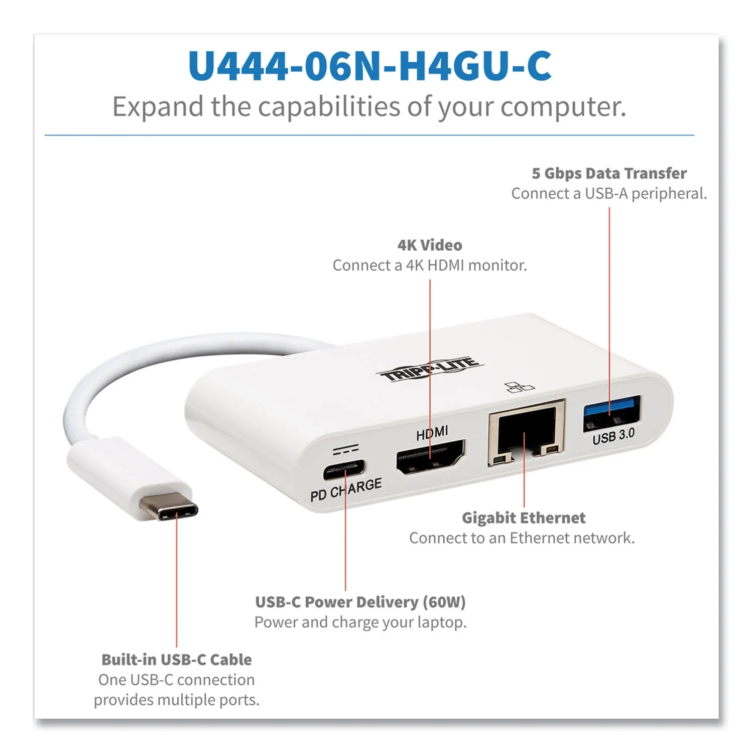 Marketing Information:USB 3.1, generation 1 USB-C to HDMI 4K adapter expands the potential of your tablet, laptop, Chromebook, MacBook, smartphone or PC's USB-C or Thunderbolt 3 port. Plug-and-play technology makes installation quick and simple - with no software or drivers to install. Fumble-free, reversible USB-C plug connects in either direction for a quick connection every time. To send digital audio and HD video to an HDMI TV, projector or monitor, connect the HDMI port to the display using an HDMI cable (sold separately). The HDMI port supports UHD video resolutions up to 3840 x 2160 (4K x 2K) at 30 Hz. Adapter is perfect for transmitting digital audio and 4K video to a large display, adding a thumb drive or other USB peripheral, powering and charging a PD Charging-compliant mobile device, and connecting to a Gigabit Ethernet network all at the same time.