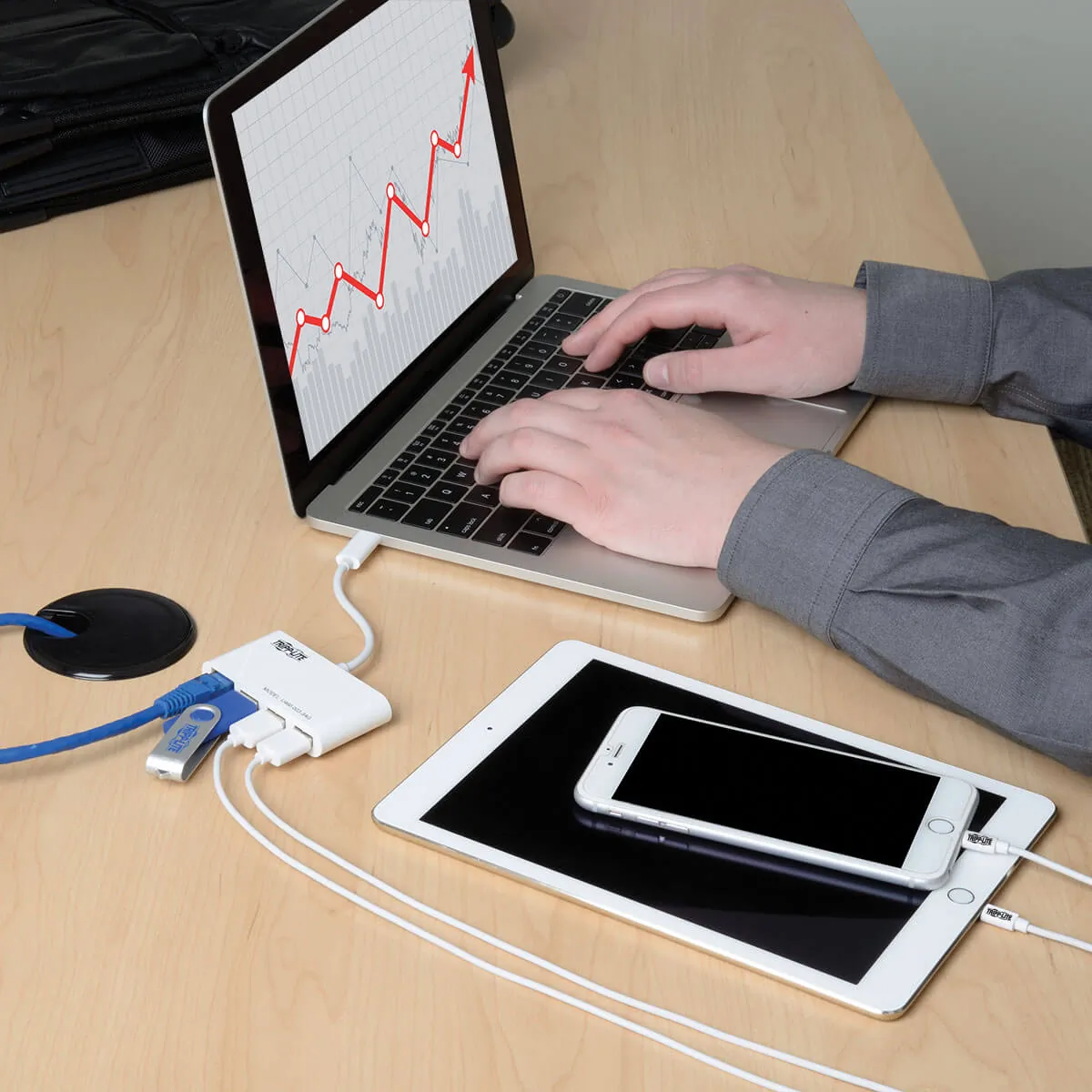 USB 3.1, generation 1 USB-C hub/adapter expands the potential of your tablet, laptop, MacBook, Chromebook, smartphone or PC's USB-C or Thunderbolt 3 port. Plug-and-play technology makes installation quick and simple - with no software or drivers to install. Fumble-free, reversible USB-C plug connects in either direction for a quick connection every time. Three USB-A ports accept USB peripherals, such as a flash drive, mouse, keyboard or printer, and each provides up to 0.9A for charging smartphones and other mobile devices. All ports support fast data-transfer rates up to 5 Gbps and are backward-compatible with previous USB generations so you can continue using older peripherals while getting high-speed performance from new devices. Hub/adapter is perfect for adding a thumb drive and other USB peripherals, charging a mobile device, and connecting to a Gigabit Ethernet network all at the same time.