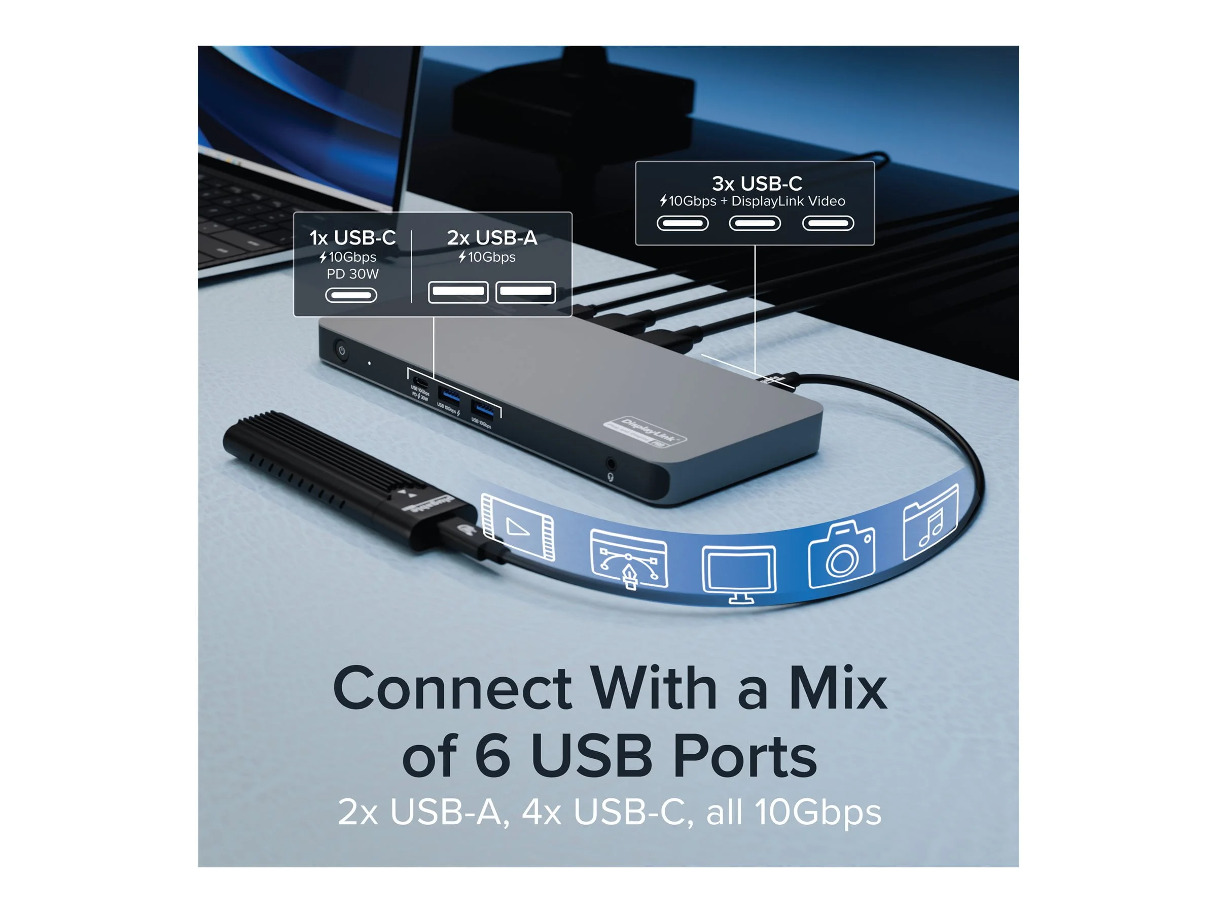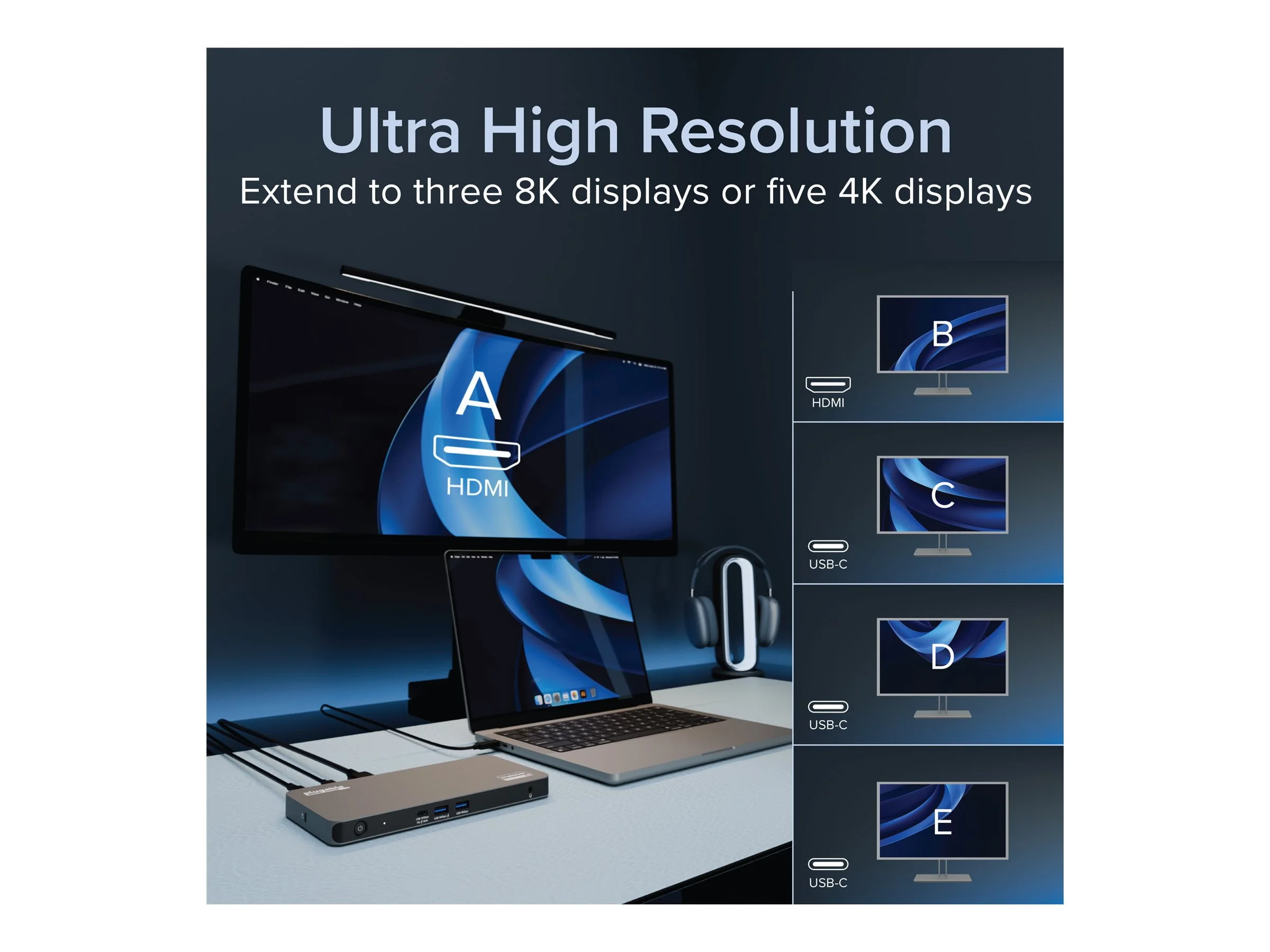 Featuring dual HDMI ports and multiple USB-C connections, it supports high-speed data transfer and stable Ethernet connections. Enhance your setup with this versatile and efficient dock.