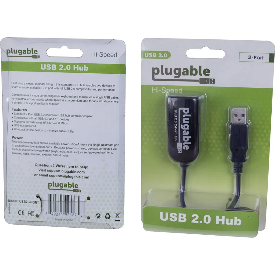 The Plugable USB 2.0 2-Port Hub with Power Adapter is the perfect solution for expanding your USB connectivity. This compact hub allows you to connect multiple USB devices to your computer effectively and conveniently.