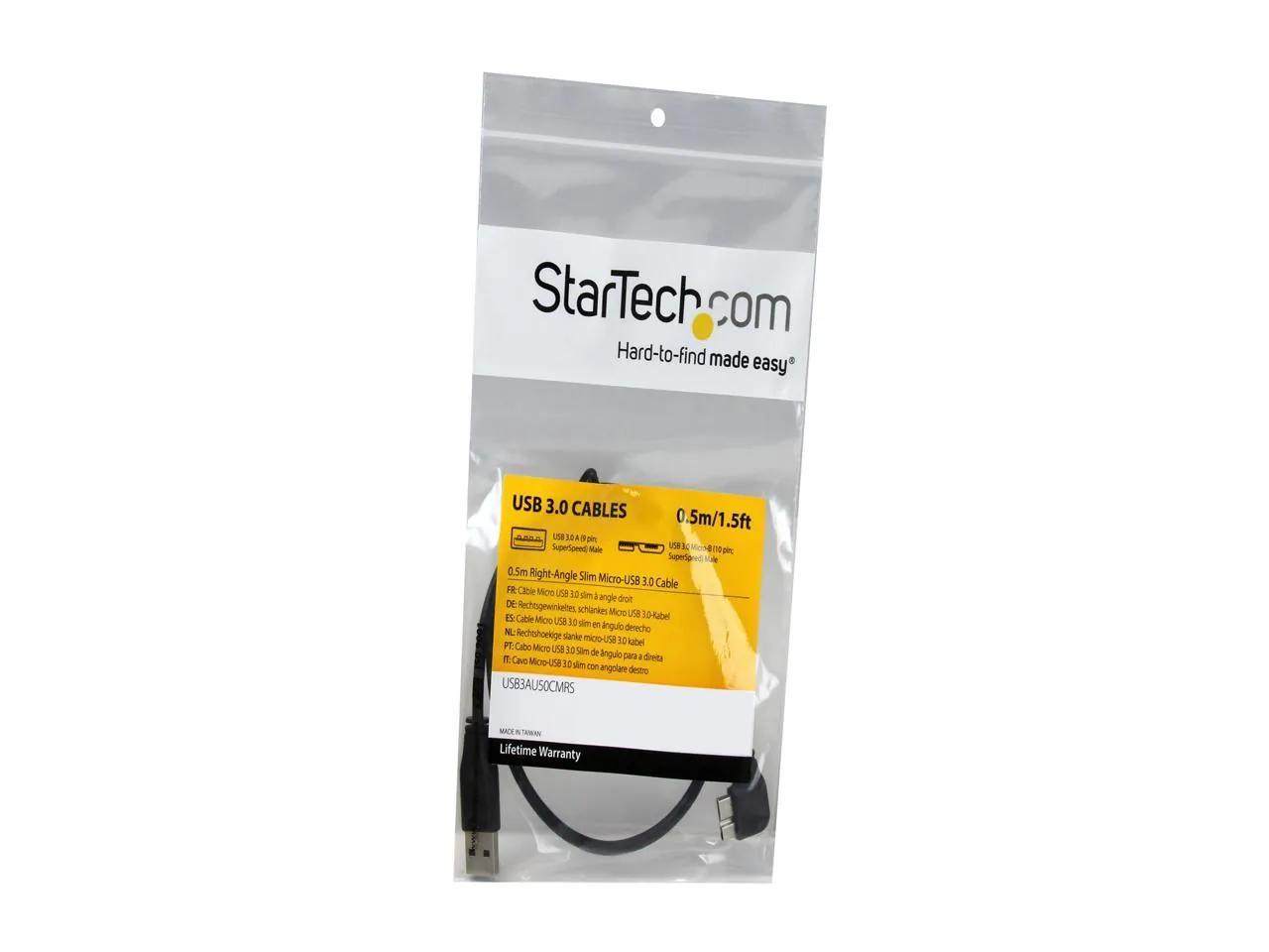 The StarTech.com 0.5m Slim Micro USB 3.0 Cable is designed for maximum flexibility and performance. This cable features a USB 3.0 A connector and a right-angle Micro USB connector, ensuring a secure connection in tight spaces. With USB 3.1 Gen 1 technology, it supports data transfer speeds of up to 5 Gbps, making it ideal for connecting smartphones, tablets, and other devices.