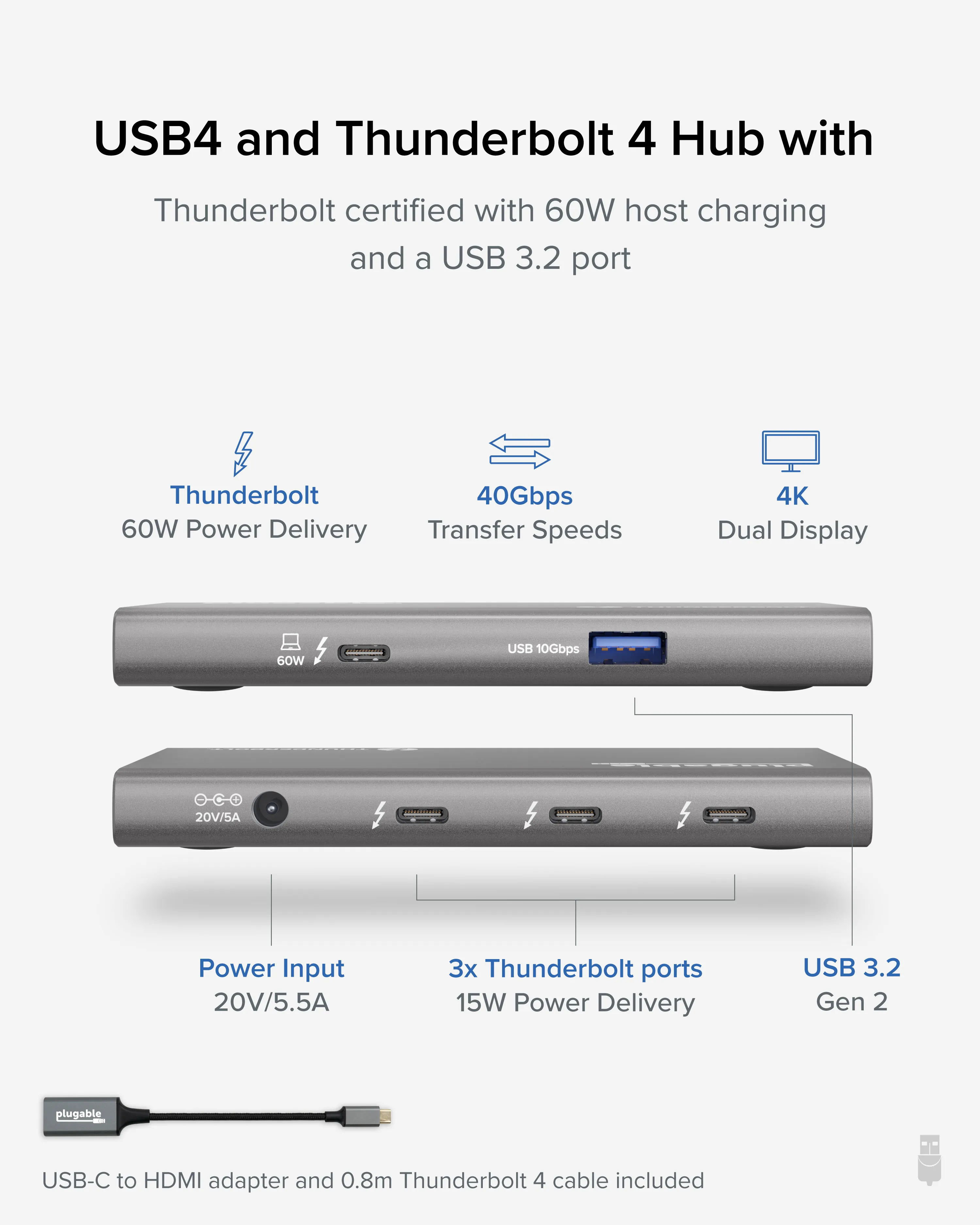 PLUGABLE USB4 HUB, 5-IN-1 THUNDERBOLT 4 HUB WITH 60W CHARGING, INCLUDES 1X USB-C