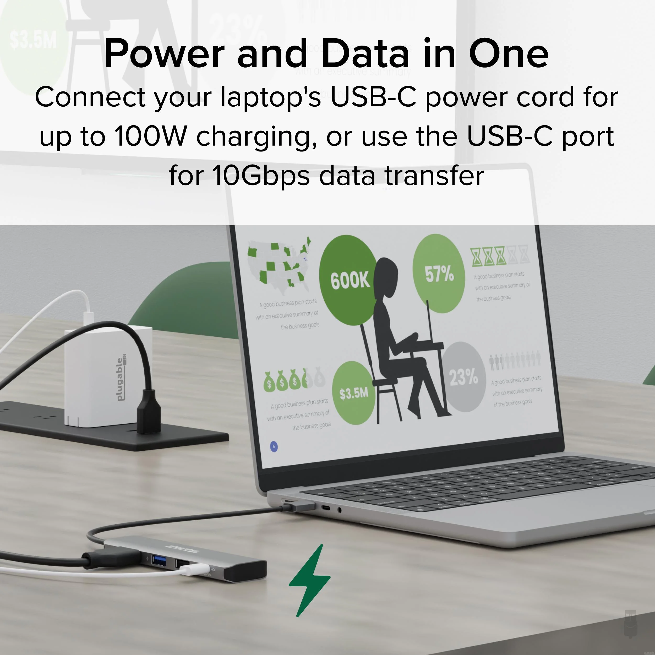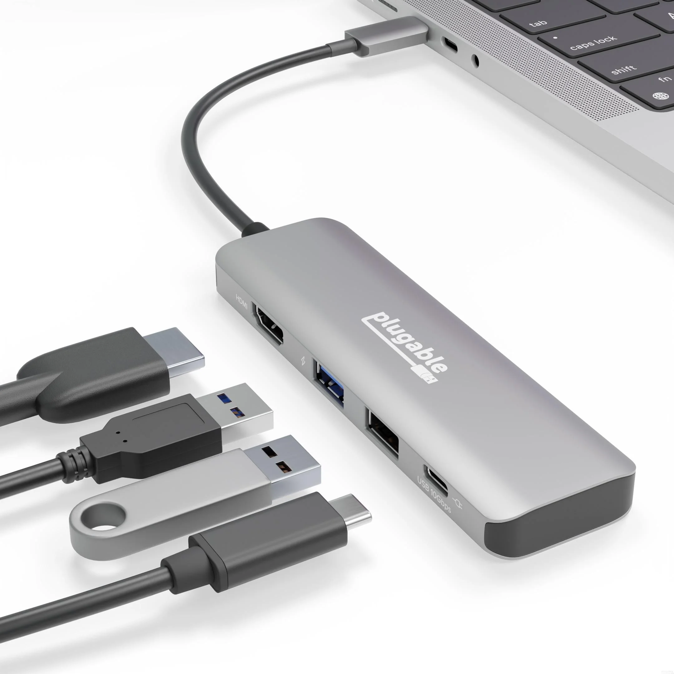 The Plugable USB-C 4-in-1 Hub is the ultimate solution for connecting multiple devices to your laptop or tablet. With HDMI output, you can easily connect to an external monitor, while the USB ports allow you to connect peripherals hassle-free. Experience high-speed data transfer and power delivery with this compact and versatile hub.