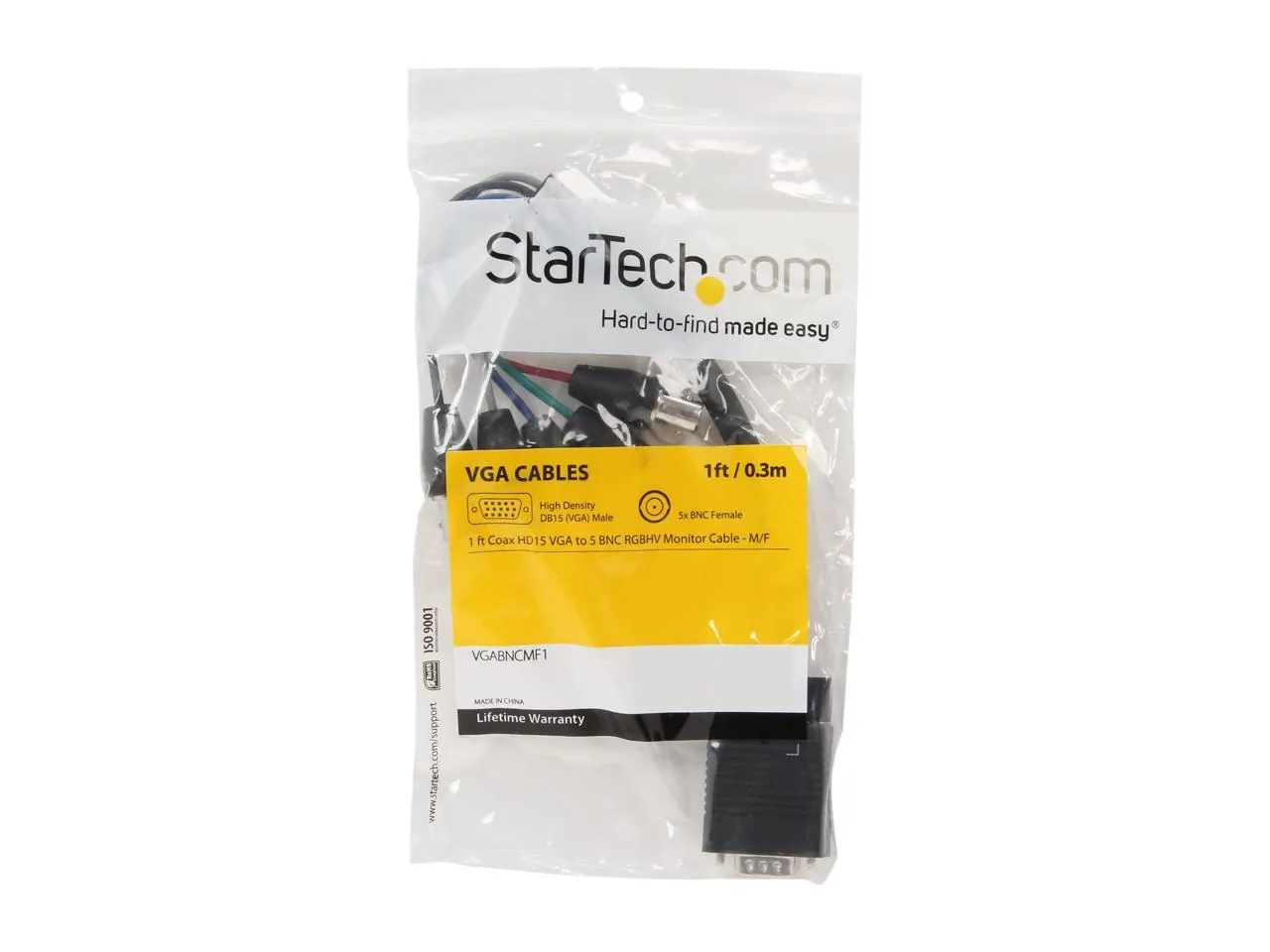 The VGABNCMF1 1-foot Coax HD15 VGA to 5 BNC RGBHV Adapter Cable features an HD15 VGA (male) connector and 5 BNC (RGBHV) (female) connectors, allowing you to connect your existing BNC video source to a VGA distribution amplifier or PC.