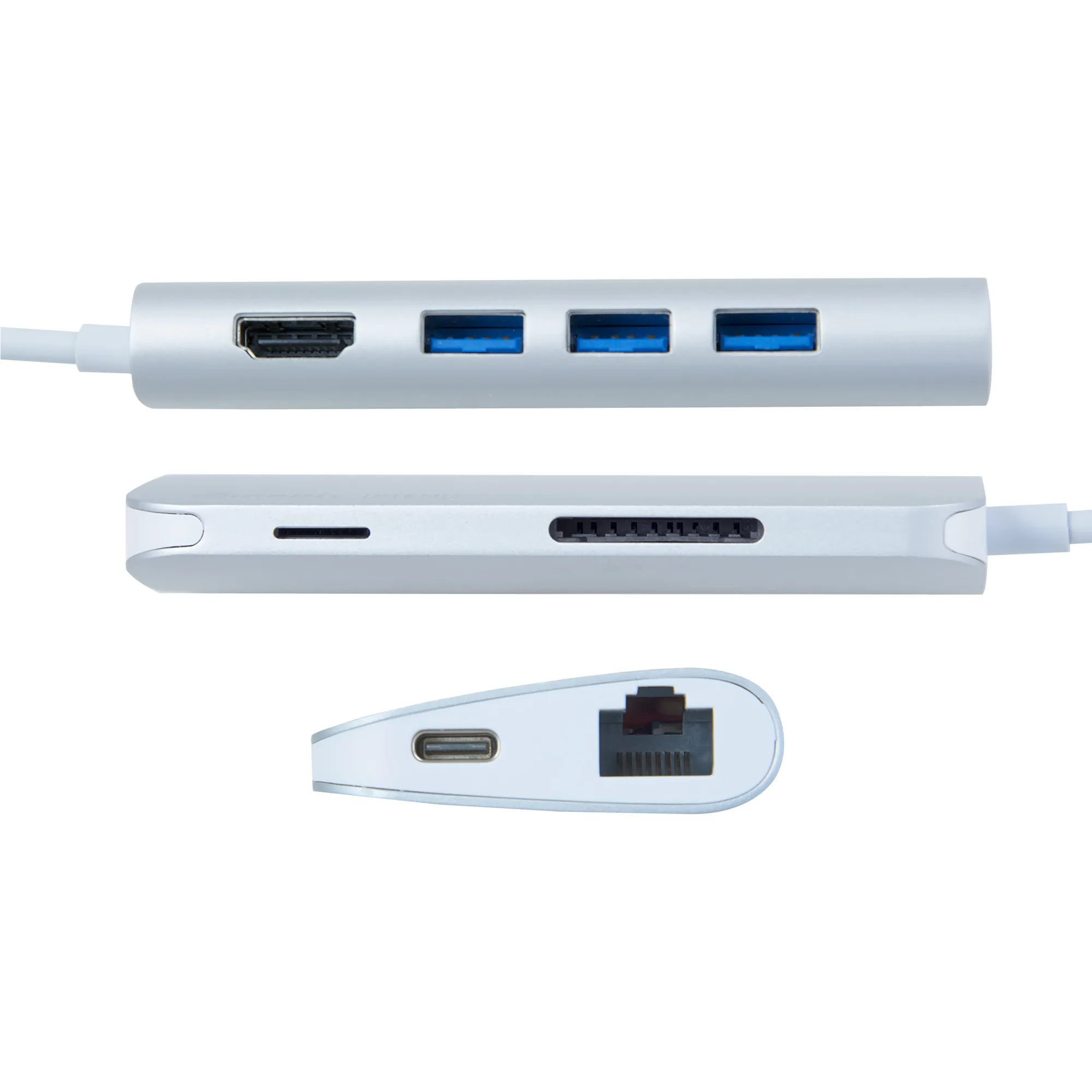 Have a laptop or Chromebook with a USB-C port? The USB-C Multi-Port Hub provides the power of a desktop docking station in an ultra-portable size. Expand your reach. Connect to hard drives, printers, smartphones, cameras and more with the Multi-Port Hub?s 3 high-speed USB 3.0 ports. Watch your movies and videos on monitors and flat screen TVs (up to 4K) using the Hub?s HDMI port. Move photos with dual SD Memory Card Readers; or connect to networks with the Hub?s 1-Gigabit Ethernet port.