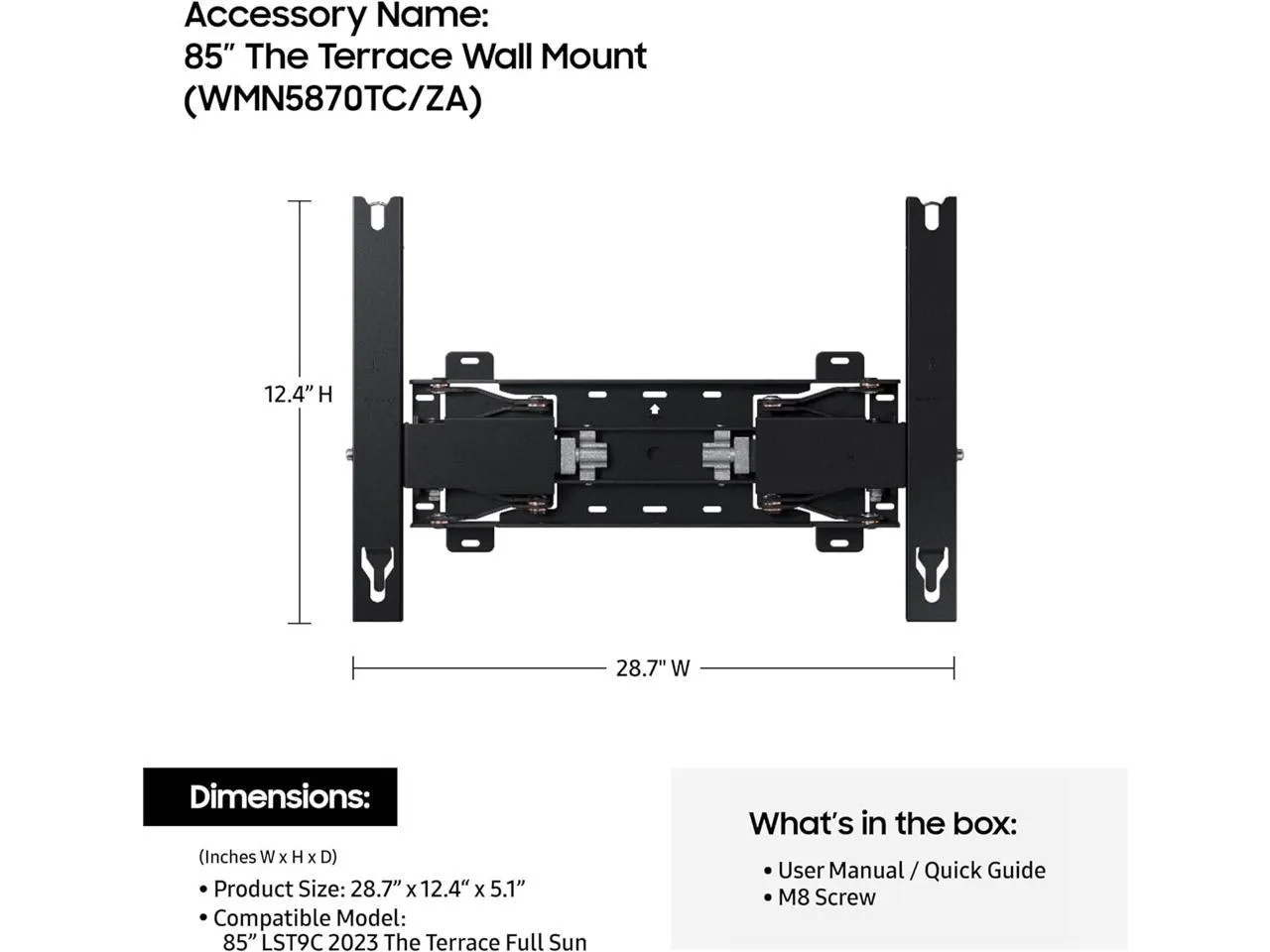 The Samsung WMN5870TC Wall Mount is designed for 85-inch Samsung Terrace TVs released in 2023. This robust mount ensures a secure and aesthetic installation, making it ideal for outdoor viewing.