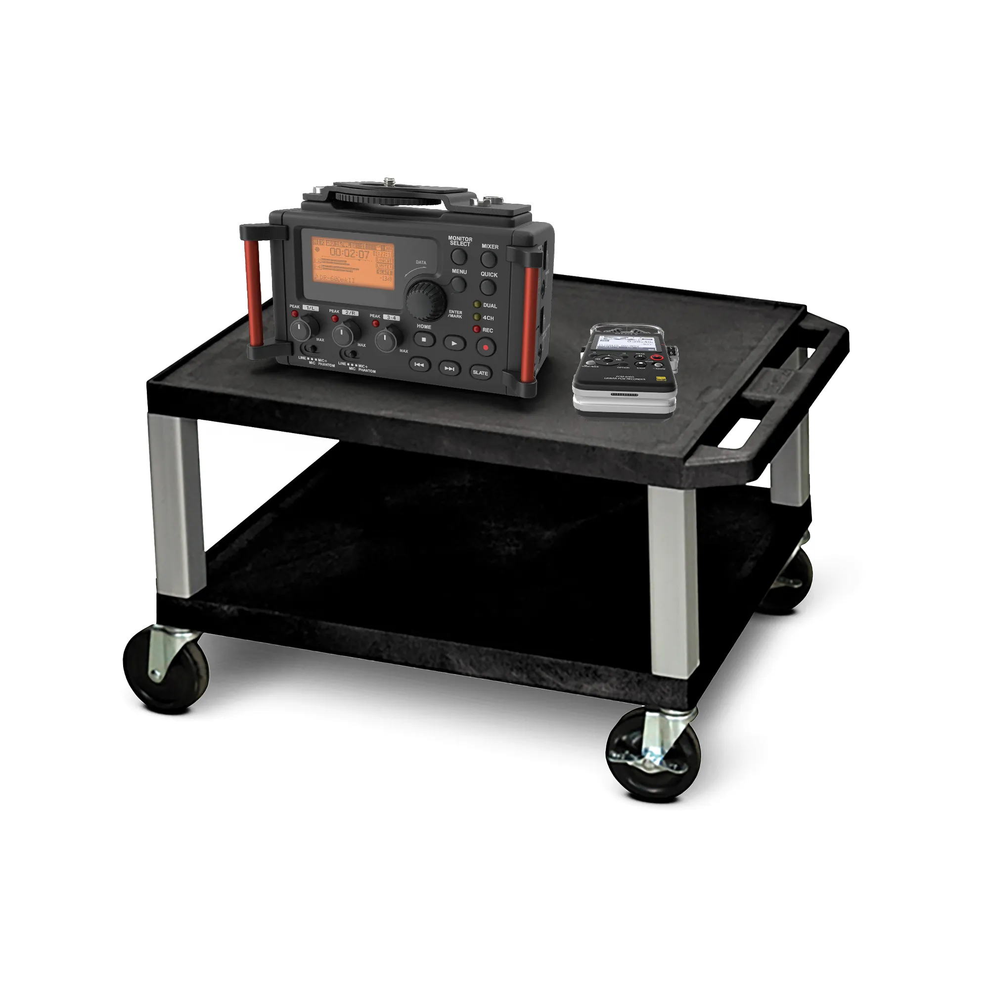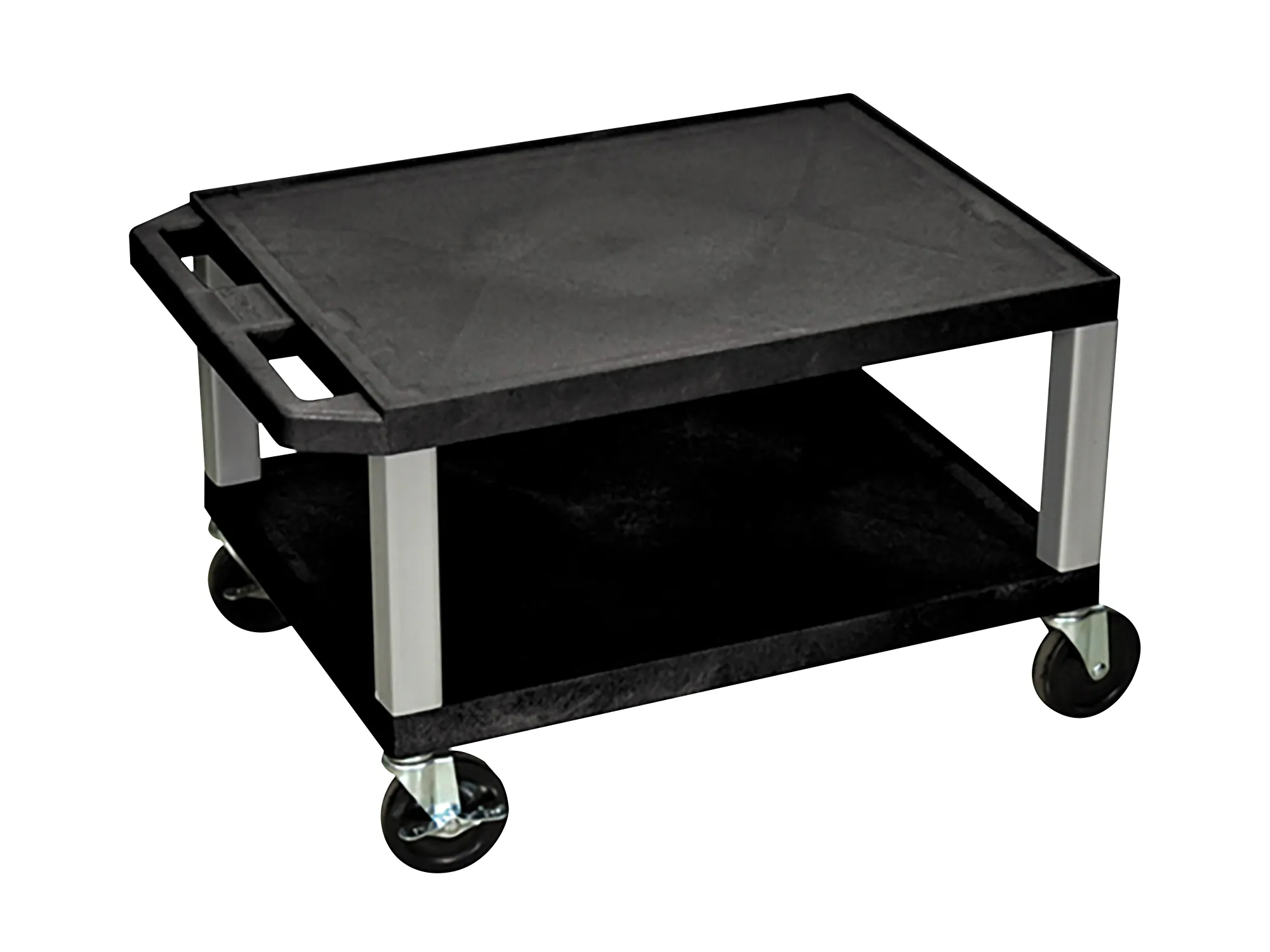 This mobile AV cart stands at 16" high and features two durable 1.5" thick shelves designed to support and transport audio/video equipment and more. Both shelves are crafted from molded plastic, ensuring they won't chip, warp, scratch, rust, or peel, while a textured surface and a .25" retaining lip help contain your items securely.