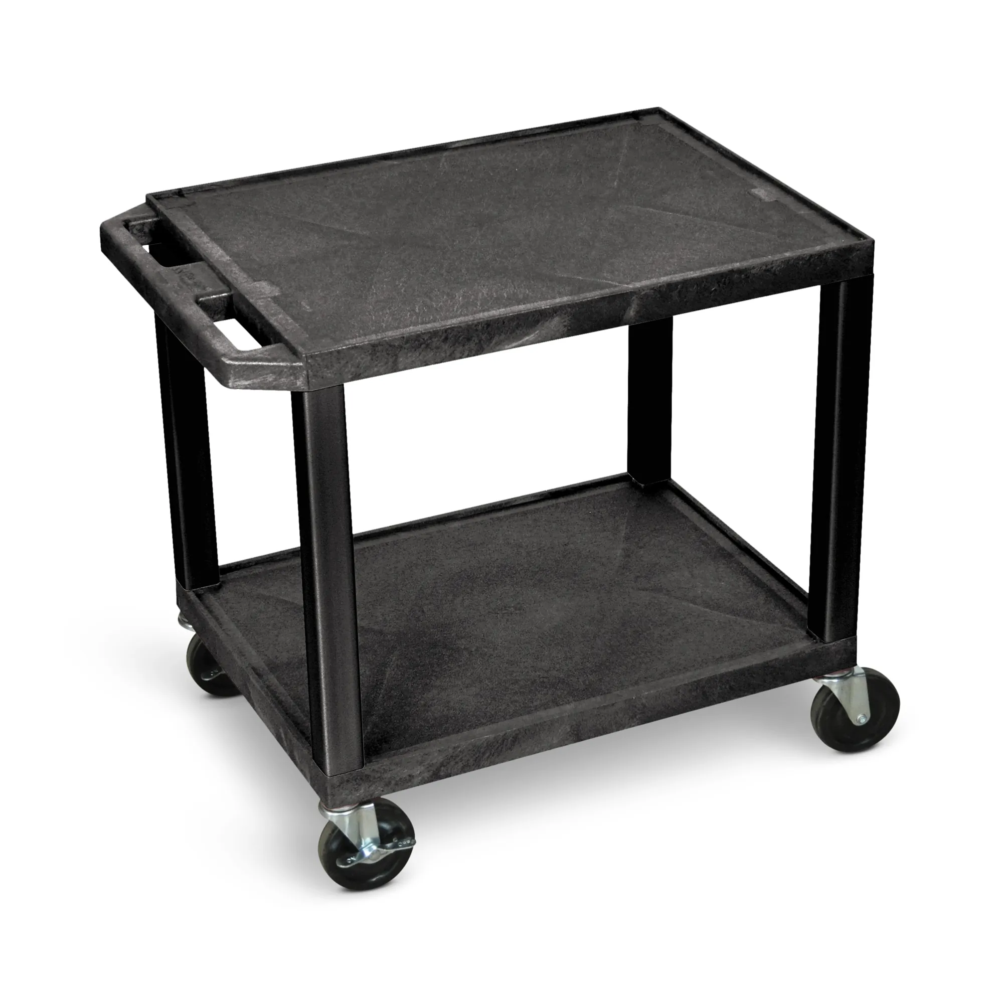 Whether you're looking for a basic AV cart or a multipurpose utility cart, this mobile cart is built to last. Its two shelves, with a textured surface and 0.25" retaining lip to help secure items, are made from durable thermoplastic resin that won't chip, warp, scratch, rust, or peel. A push handle is molded into the top shelf for greater control and includes a built-in three-outlet electrical assembly, while four heavy-duty casters provide smooth mobility across a variety of surfaces. Need to stabilize the cart? Simply activate the two locking brakes. Plus, it's proudly made in the USA.