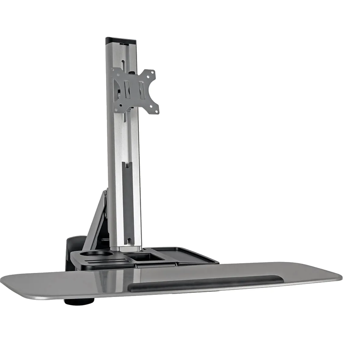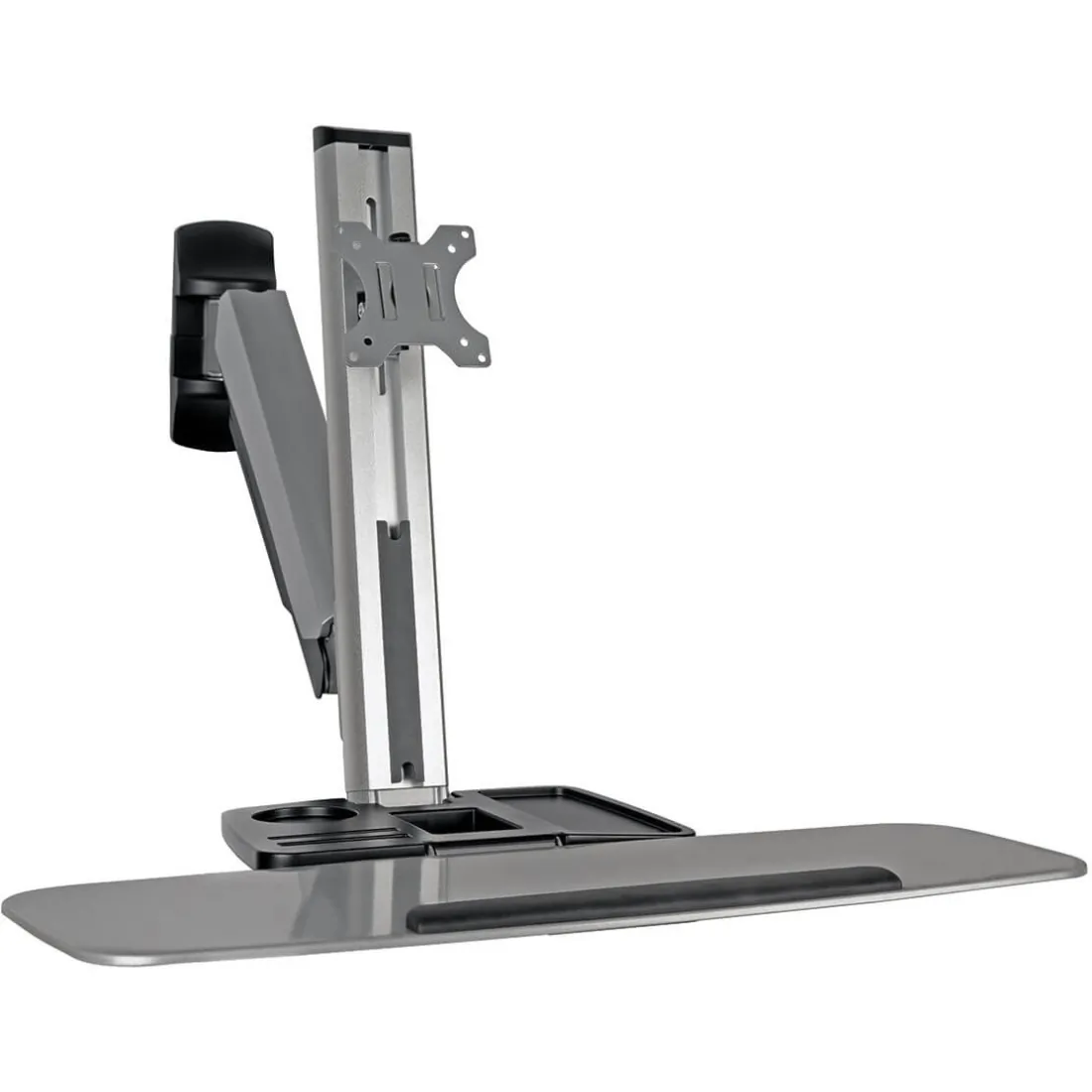 General InformationEnjoy the Benefits of Standing During Your WorkdayThis WorkWise sit-stand workstation mounts to the wall using the included hardware, allowing you to enjoy the benefits of better workplace ergonomics. Standing for part of the day can help increase metabolism, improve alertness and productivity, reduce fatigue and decrease the risk of repetitive stress injuries. Ideal for home, school or office use, the WWSS1332W lets you sit or stand with 19.5 inches of single-motion height extension. Easy to Adjust to Your Liking With a Single TouchJust one touch is all it takes to adjust your wall-mounted workstation's angles and heights to fit your comfort level. All sections move together for smooth transitions between sitting and standing modes. The full-motion arm tilts from -180 to +180 to give you plenty of flexibility in minimizing glare and providing comfortable viewing. It also rotates 360 degrees for viewing in portrait or landscape orientation. Increase or decrease tension using the included hex key to compensate for heavier or lighter loads. VESA-Compliant Mount Supports Up to 17.6 lb.The VESA-compliant single-arm mount fits most flat-panel monitors, televisions and other displays from 13 to 32 inches. It's compatible with 75 x 75 mm and 100 x 100 mm VESA mounting-hole patterns. Extra-Large Keyboard Tray Holds the Most Popular ModelsThe large keyboard tray measures 26.2 x 10.2 inches and flips up to save space when not in use. A secondary surface is ideal for telephones, fans and other desk accessories. 5-Year Warranty and Environmentally Responsible DesignThe WWSS1332W sit-stand workstation comes with a 5-year warranty. It's manufactured in compliance with strict RoHS specifications, reflecting Tripp Lite's commitment to environmental responsibility.Product InformationDevice Supported: Flat Panel DisplayDevice Supported: TVDevice Supported: KeyboardDevice Supported: TelephoneDevice Supported: FanNumber of Displays Supported: 1Maximum Load Capacity: 17.64 lbMaximum Screen Size Supported: 32"Physical CharacteristicsColor: BlackVESA Mount Standard: 100 x 100VESA Mount Standard: 75 x 75Weight (Approximate): 20 lbMiscellaneousPackage Contents: Bracket Arm Support Mast Keyboard Shelf 2 X Decorative Covers Hex Key, 4 mm Hex Key, 6 mm Mounting Hardware Owner's Manual Environmentally Friendly: YesEnvironmental Certification: RoHSWarrantyLimited Warranty: 5 Year
