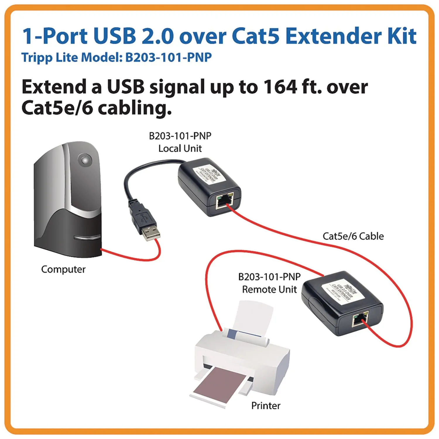 Tripp Lite's 1-Port Plug and Play USB 2.0 Over CAT-5/CAT-6 Extender Kit transmits data from your computer to a USB 2.0 peripheral up to 164ft away. It has plug and play functionality, meaning you don't have to install drivers or software. For added convenience, the transmitter has a built-in USB-A cable for connection to your computer. The USB signals travel between the transmitter and receiver units over user-supplied CAT-5 or CAT-6 cable. It's a simple, cost-effective solution for connecting your computer to a printer or other USB peripheral that lacks network connectivity and is farther than 16 ft. away from your computer, which is the distance limitation for USB cables. For example, you can use the B203-101-PNP to connect an impact printer to a server in another room. This extender kit is also convenient for making connections in areas without network availability.