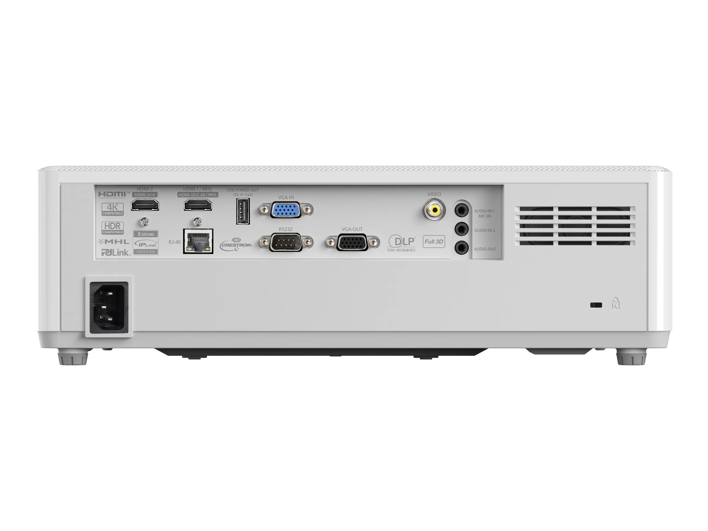 1x HDMI 2.0 (HDCP 2.2, MHL), 1x HDMI 1.4, 1x composite, 1x VGA, 1x audio in, 1x mic in, 1x USB-A (power), 1x VGA out, 1x audio out, 1x 12v trigger