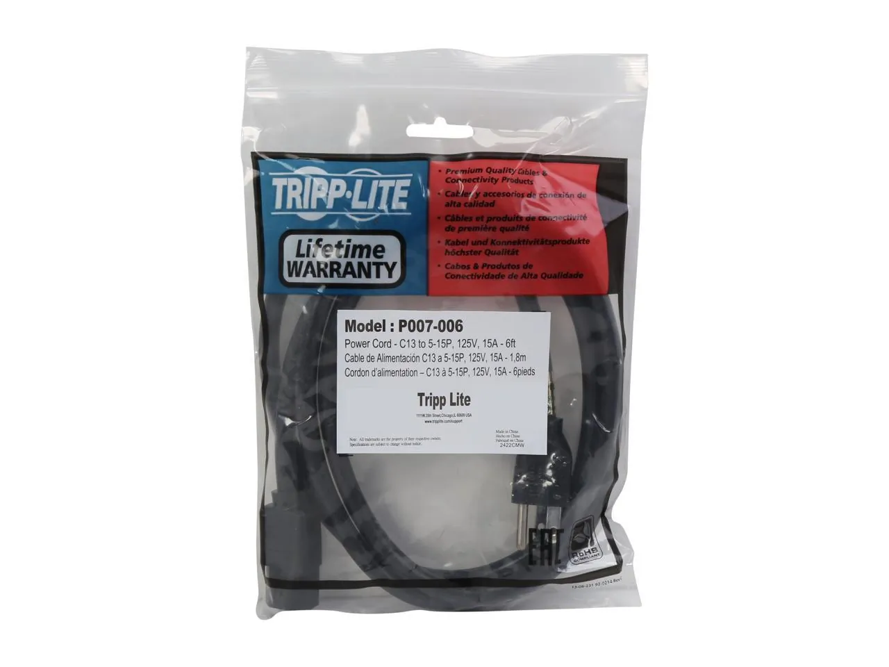 6ft AC Power Cord, C13/5-15P 125V, 15A, 14Awg SJT: Use Tripp Lite's P007-006 in server applications that require a higher rated, heavier gauge cable. C13 to 5-15P connectors, 3 x 14 AWG conductors, 15A / 250V rating. Tripp Lite Lifetime Warranty. Molded, Heavy-Duty Power Cable, 6 ft. IEC-60320-C13 to NEMA 5-15P. 14 AWG x 3C, SJTW, 15A, 250 Volt. UL, CSA, VDE, RoHS Compliant.