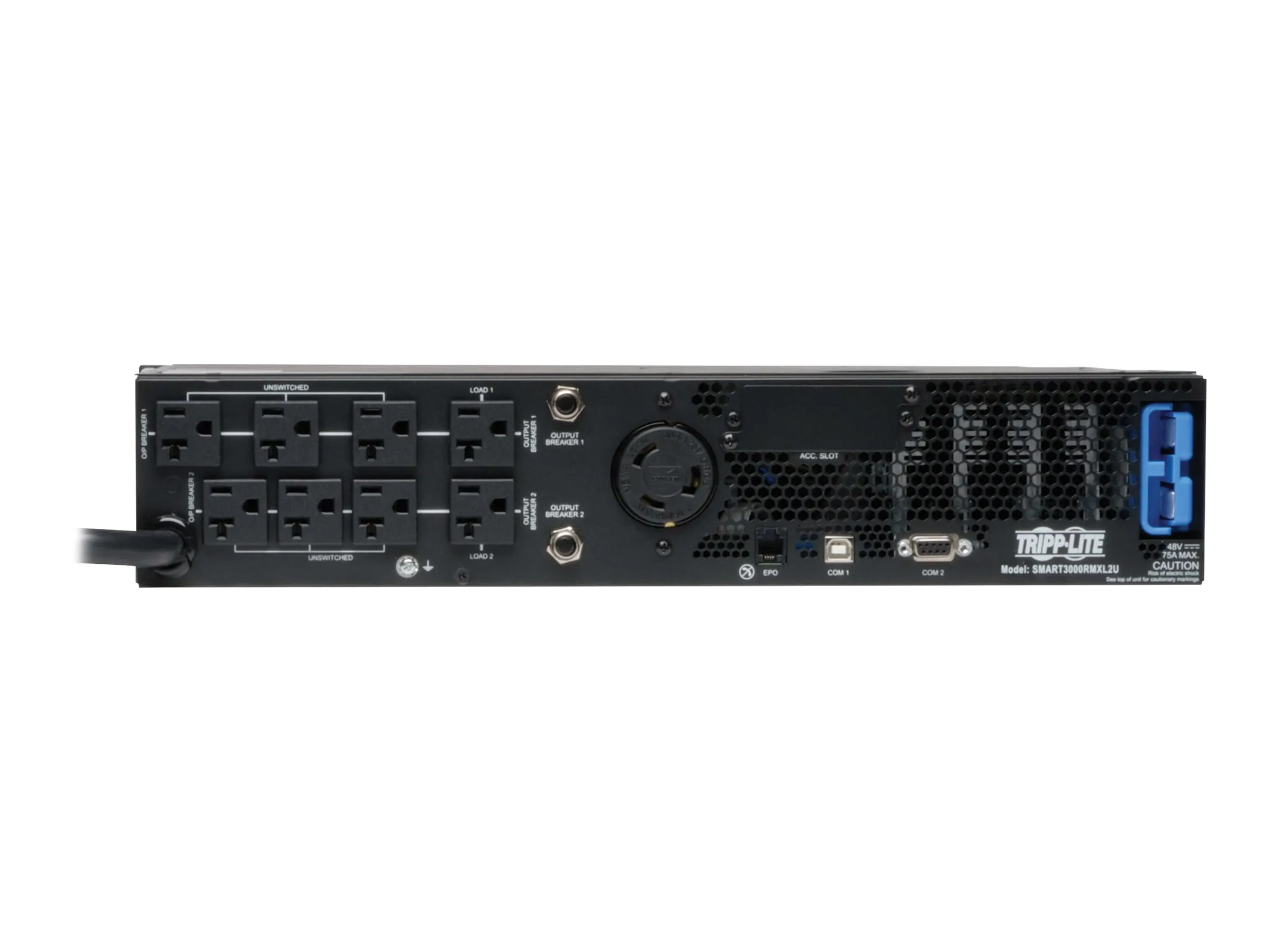 Receptacles: 8 x NEMA 5-15/20R, 1 x NEMA L5-30RSwitching Time: 5 msLoad Capacity (VA): 3000 VALoad Capacity (Watt): 2880 WInput Voltage: 110 V ACOutput Voltage: 120 V ACBackup/Run Time (Full Load): 3 MinuteMaximum Battery Recharge Time: 5 HourHeight: 3.5"Width: 17.5"Depth: 19"Rack Height: 2UForm Factor: Rack-mountableWeight (Approximate): 64 lbPackage Contents: SmartPro SM3000RMXL2UTAA 3000VA Rack-mountable UPS,PowerAlert Software with USB,DB9 and EPO cabling,4 x post rackmount installation accessories,Owner's manual with warranty information,Environmentally Friendly: YesEnvironmental Certification: RoHS, ENERGY STARLimited Warranty: 2 YearTripp Lite's SM3000RMXL2UTAA is compliant with the Federal Trade Agreements Act (TAA) for GSA Schedule purchases. This product is ENERGY STAR qualified for its ability to save customers money while helping to protect the environment. Tripp Lite SmartPro Line Interactive UPS with enhanced LCD interface offers network-grade power protection for critical server, network and telecommunications equipment. Line Interactive Uninterruptible Power Supply (UPS) with built-in Auto-Voltage Regulation (AVR) actively corrects brownouts and overvoltages back to usable levels while maintaining a full battery charge in case of power failure. Tripp Lite's unique configuration excels in exceptionally poor-power environments with two separate levels of voltage boost to correct both slight undervoltages and severe brownout conditions. Interactive LCD/LED interface reports UPS operating mode, detailed UPS and site-power data, plus enables a variety of UPS setup and configuration options. Super-fast switchover from line to battery power occurs within milliseconds to maintain operation of connected equipment without interruption or reboot. 96% line-mode efficiency offers reduced heat emissions and operating costs. Network management interfaces support communications via USB, RS-232 and optional SNMPWEBCARD network interface. HID-compliant USB interface enables integration with built-in power management and auto shutdown features of Windows and Mac OS X. Network communications ports enable detailed monitoring of equipment load levels, self-test data and utility power conditions. Includes PowerAlert monitoring software and complete cabling. Switched output load banks enable scheduled and real-time remote reboot and load shedding of select outlets. Emergency Power Off (EPO) interface. LED/LCD display panel easily rotates for viewing in rackmount or tower configurations. Audible alarm with push-button momentary alarm-cancel and silent-mode configuration options. Programmable self-test. Field-replaceable, hot-swappable battery modules.