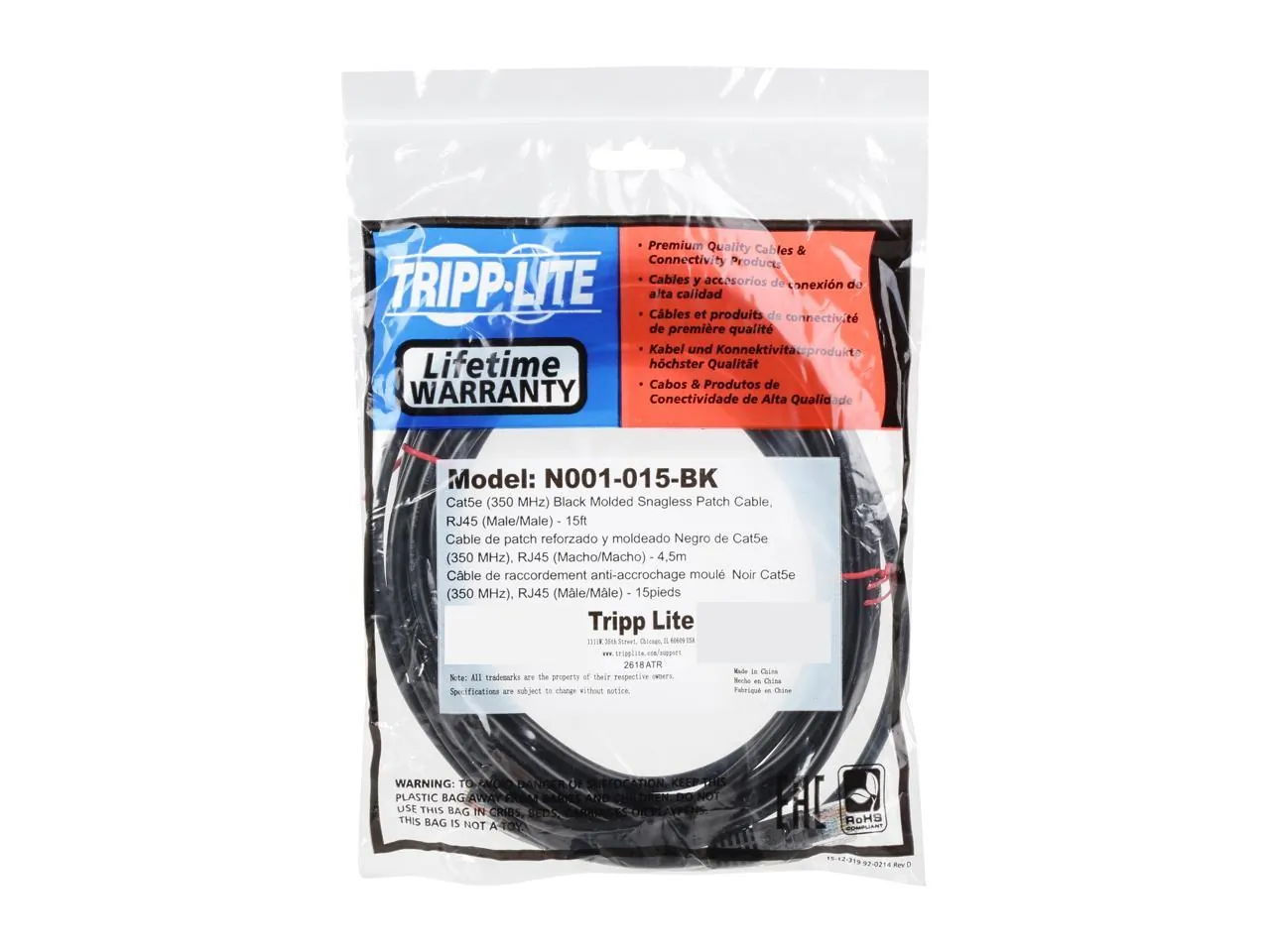 Tripp Lite 15ft Cat5e - Cat5 Snagless Molded Patch Cable RJ45 M-M Black 15' - Category 5e - 15ft - 1 x RJ-45 Male Network - 1 x RJ-45 Male Network - Black